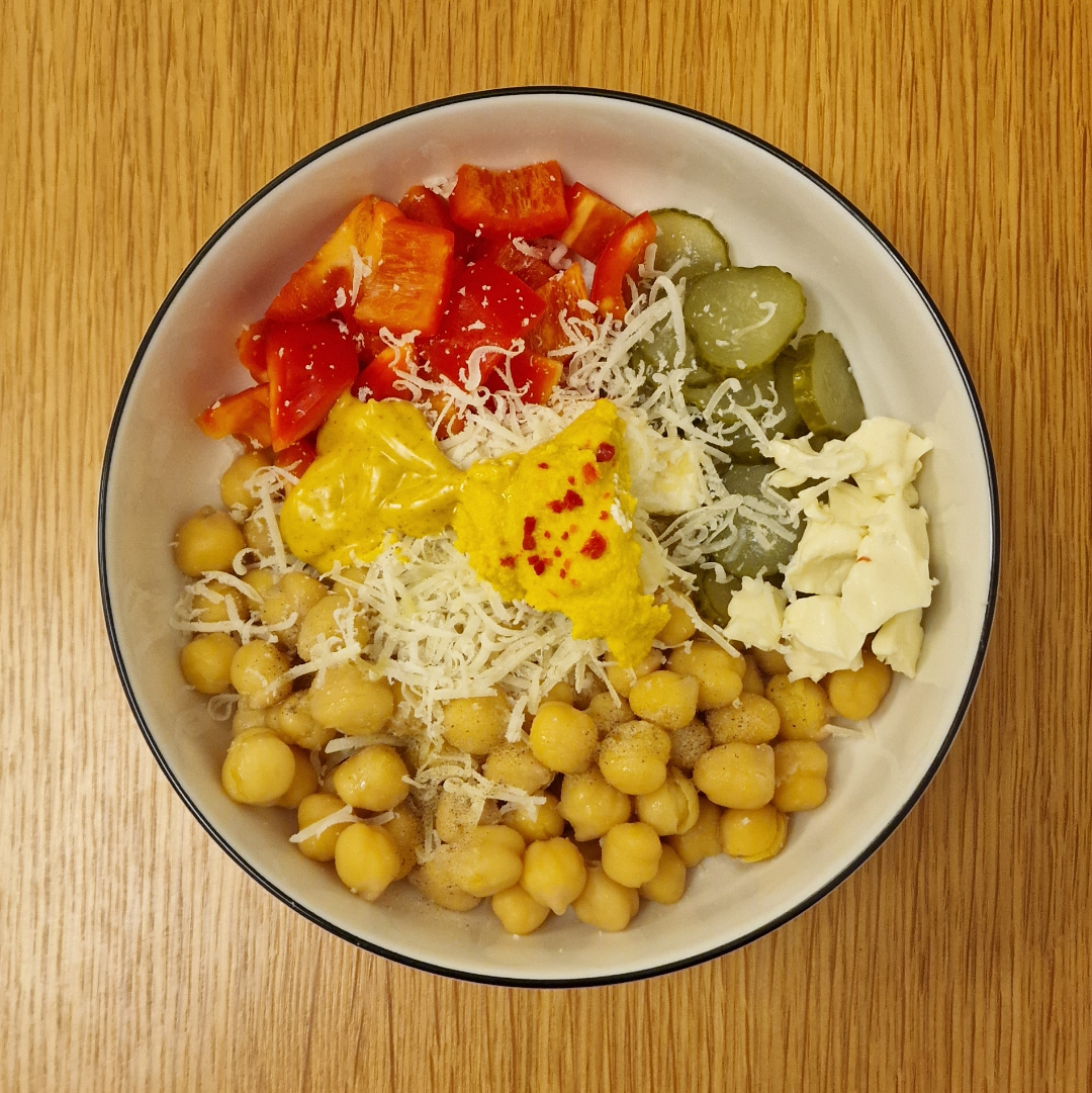 Chickpea, pepper, parmesan, pickled cucumber, hummus, cheese