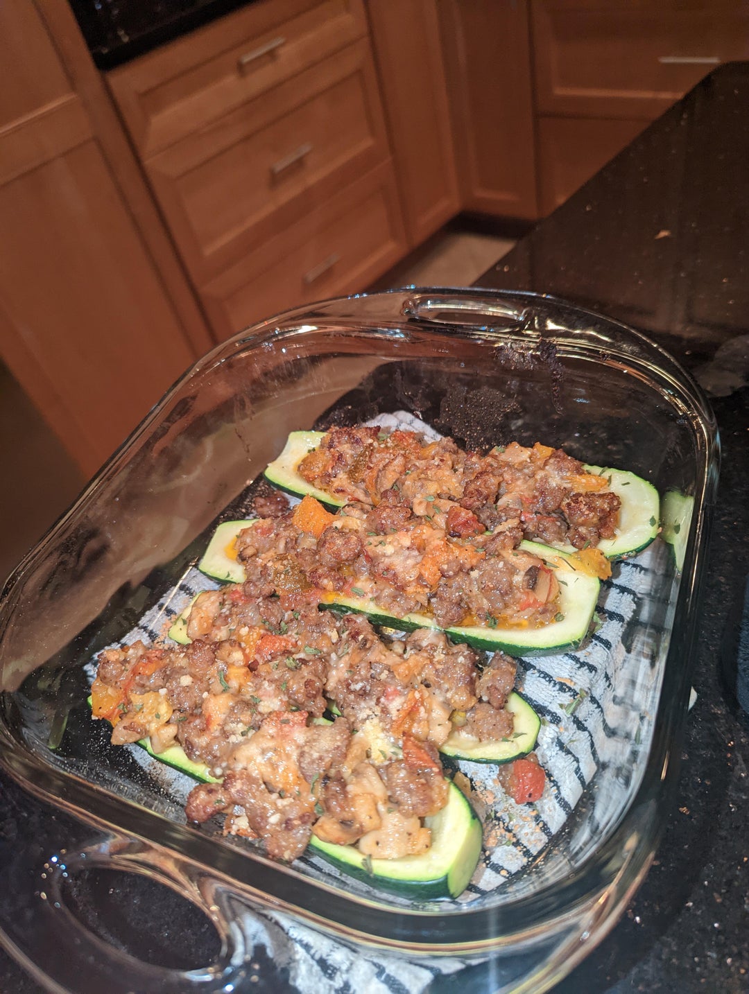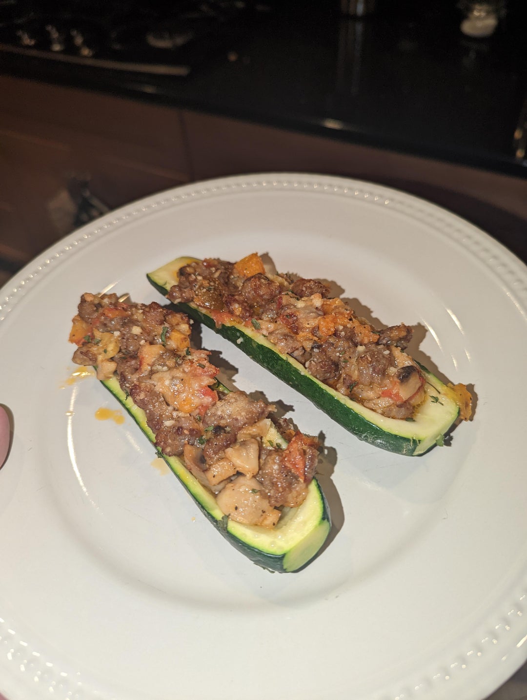 296 calories per serving. sausage, mushroom, tomato, garlic stuffed zucchini with parmesan cheese and parsley sprinkled on topby No_Angle2760 1 Comment No_Angle2760 3 years ago (per serving is two zucchini boats)Write A CommentYou must be logged in to post a comment.