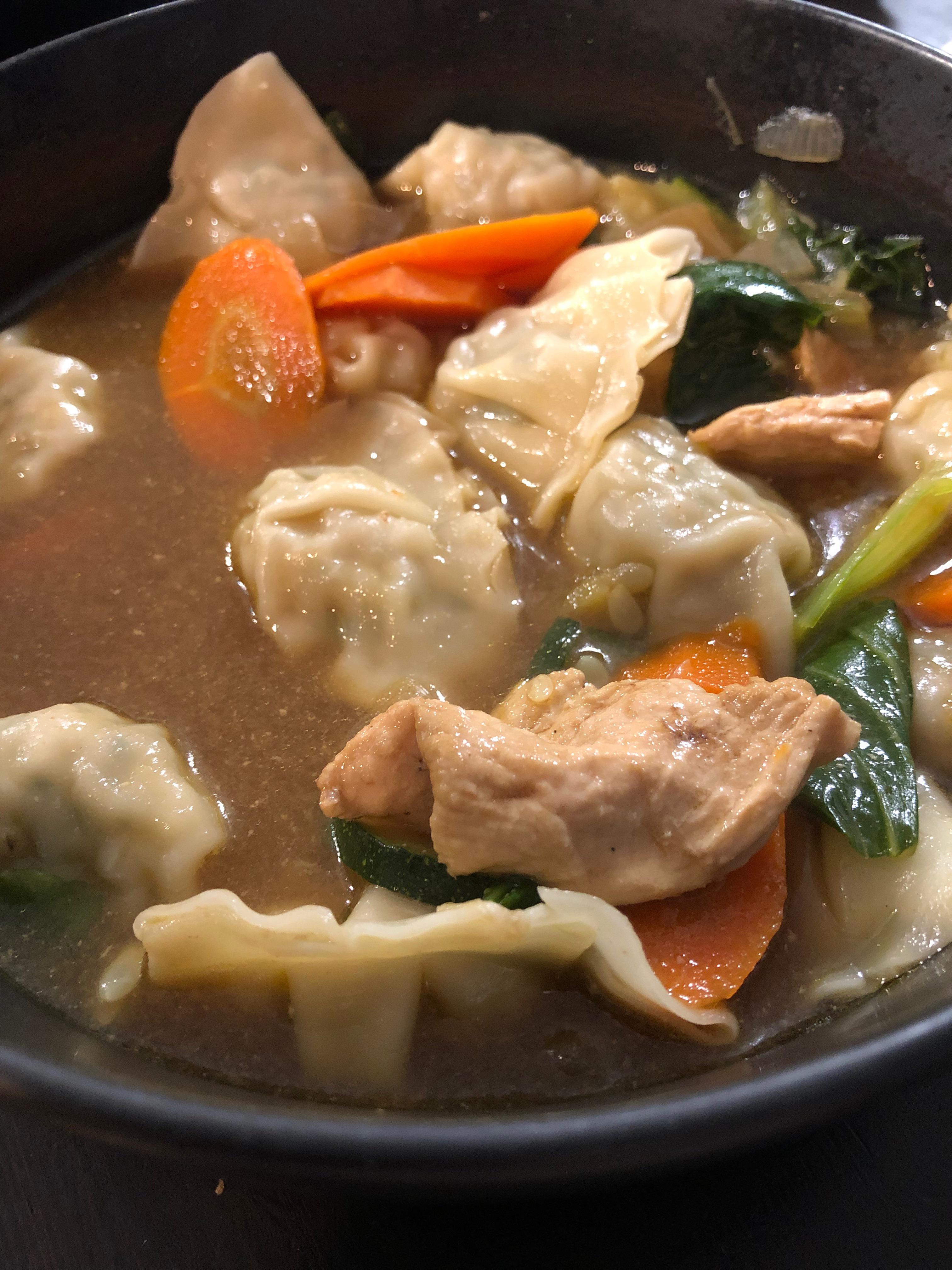 My version of the Trader Joe’s ginger miso with mini won tons. I pile in tons of veggies. I added chicken breast this time. Guessing 300-400 calories for this huge bowl.