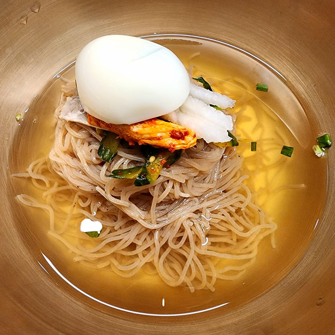 The first dish is a sort of layered hotpot, with cabbage and mushrooms on the bottom, covered with suyuk, dumplings, and meat fritters, in a rich beef broth. The second is Pyeongyang-style naengmyeon, which is much simpler than the Hamheung style, but with a focus on the savory, meaty broth instead of the sour and spice of the Hamheung style.