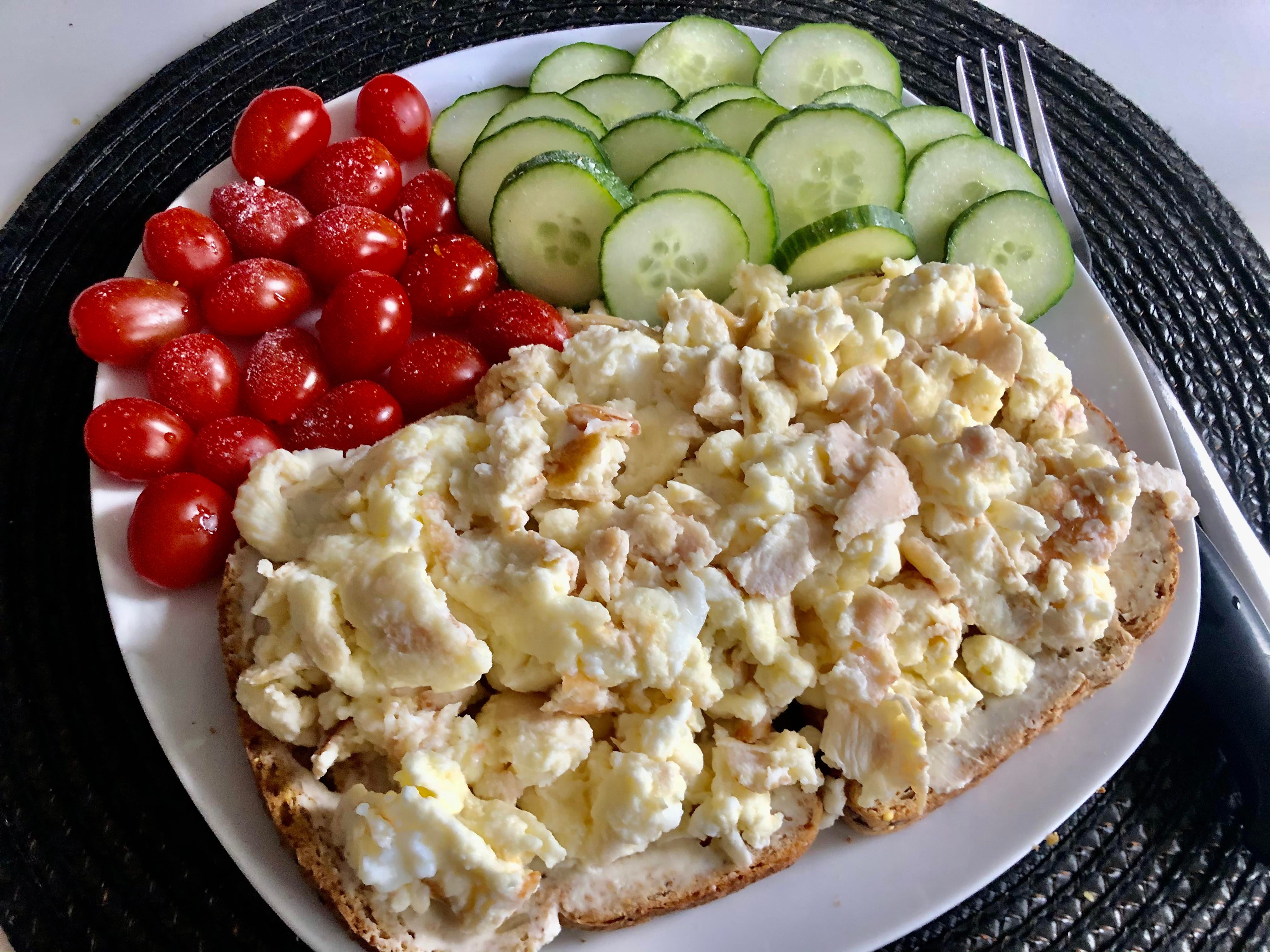 I shred the turkey in a non-stick sauce pan, then add the egg and egg white with a tiny pinch of salt, then scramble (no added fat). I spread one portion of cheese per slice of toasted bread, then pour the scrambled eggs on it, kind of like an open face breakfast sandwich. On the side are cherry tomatoes and sliced cucumber with a bit of salt.