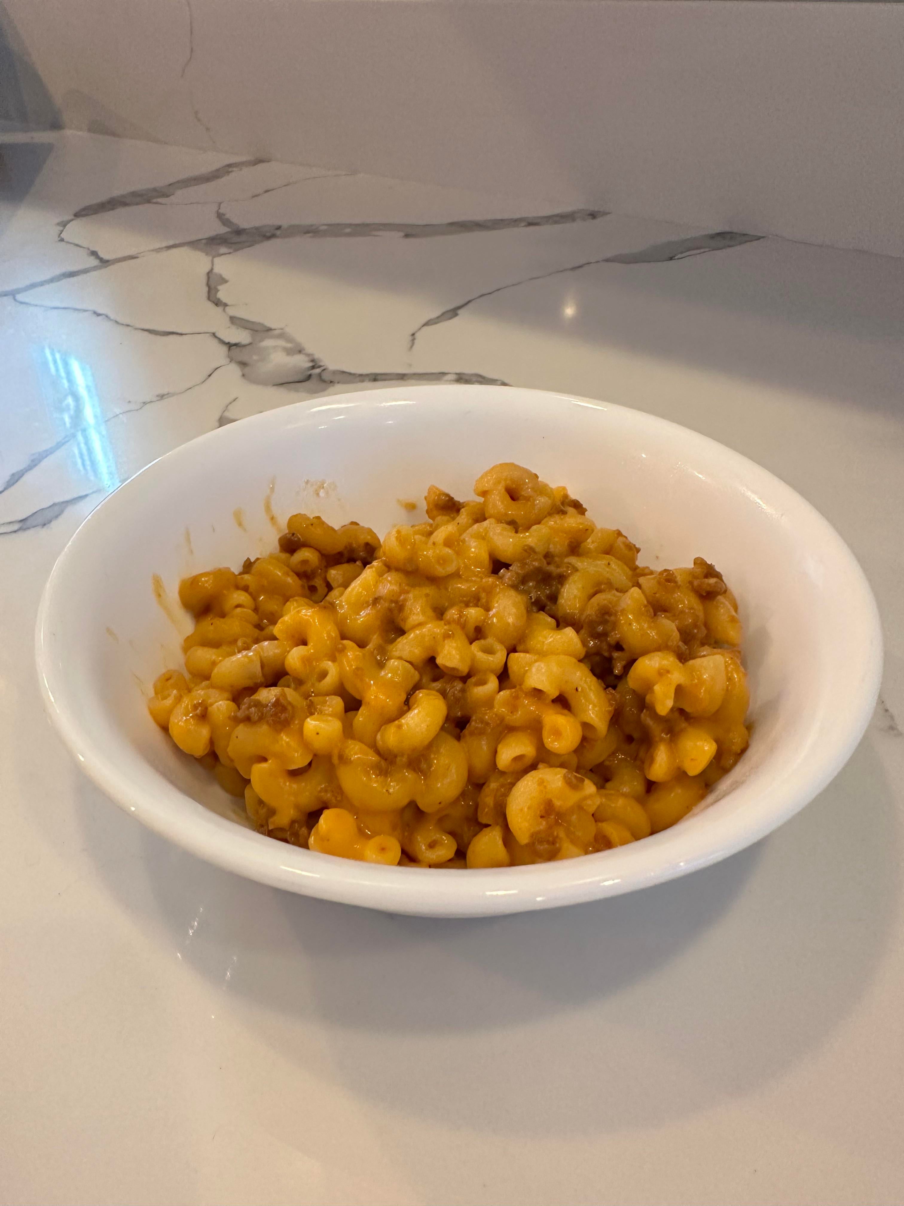 * Fiber Gourmet mac and cheese – one box – 350 kcal / 20g protein * Pea milk – 1/4 cup – 20 kcal / 2g protein * Butter – .5 tbsp – 50kcal * Gardeiin ground be’f – one serving or 87g – 120 kcal / 18g protein * Oil – a little less than a tbsp (just enough to coat pan) – 90 kcal * Worcestershire / garlic powder / onion powder / paprika / pepper