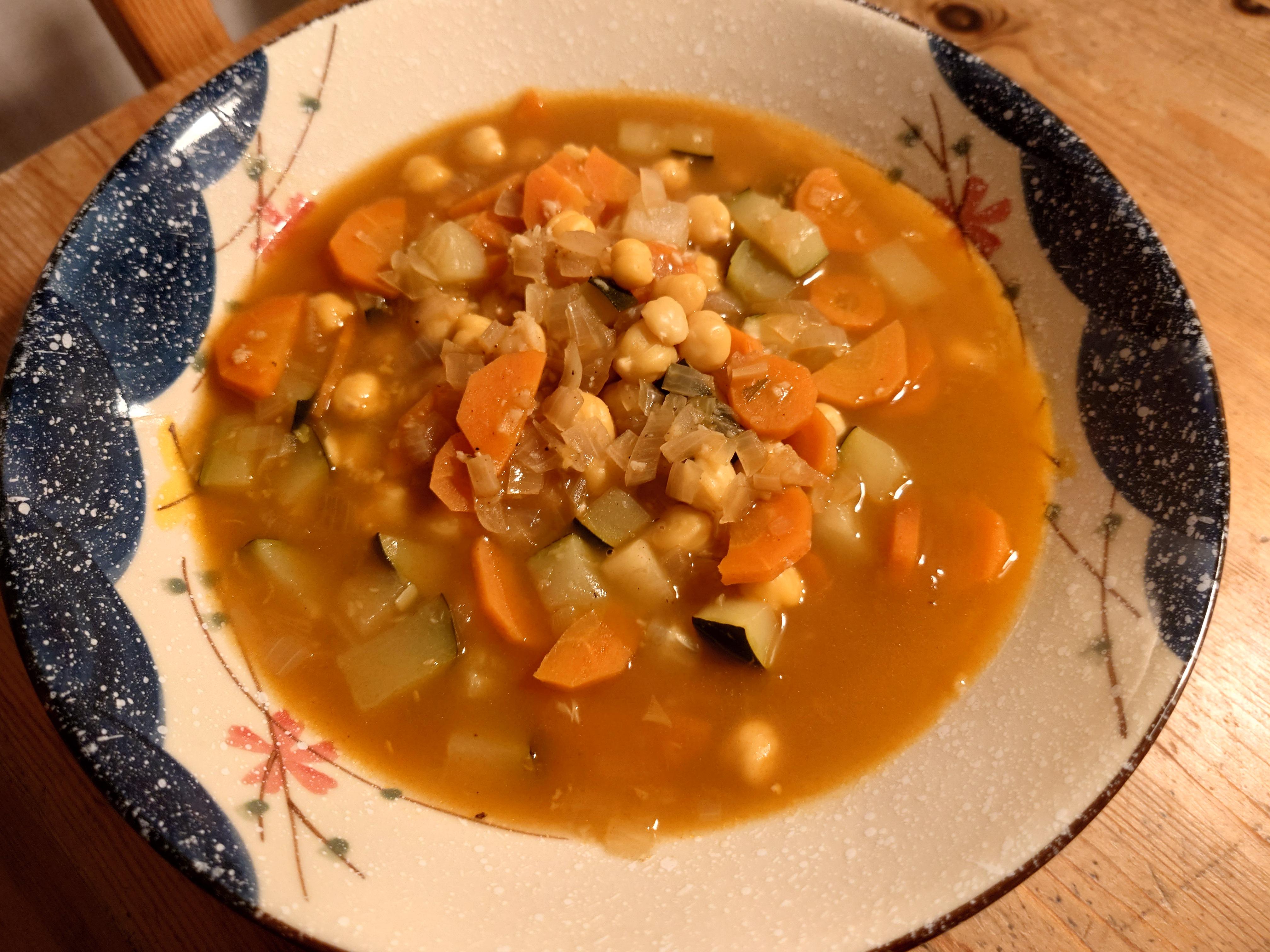 Add wine, gelatin cubes and water and bring to a low boil. Boil for a few minutes before adding zucchini. Boil for 5-10 minutes. Add chickpeas and warm until they’re at teh softness you prefer – usually not very long.
