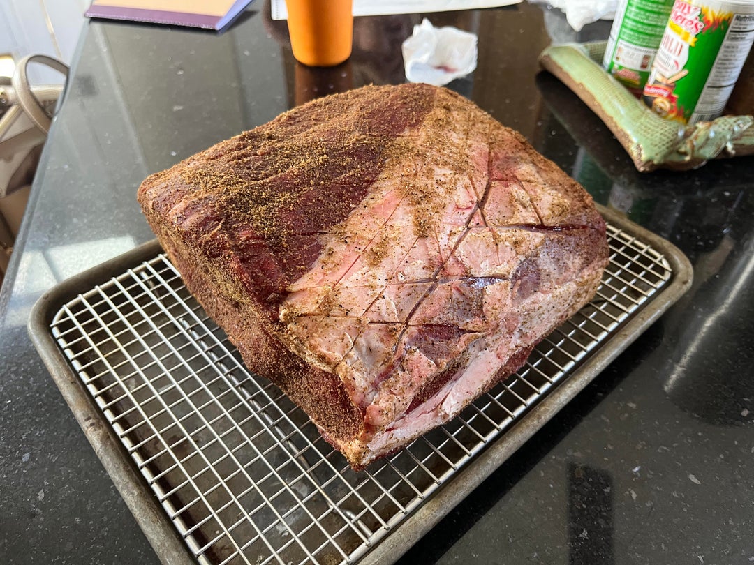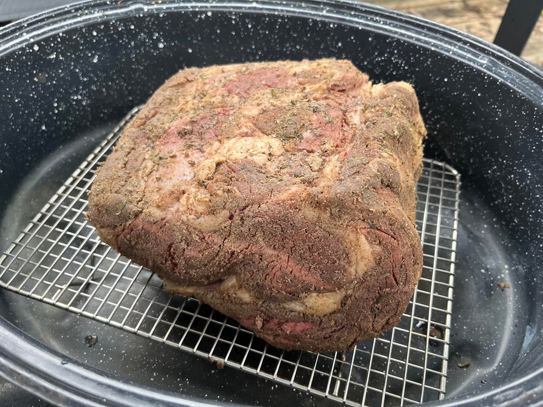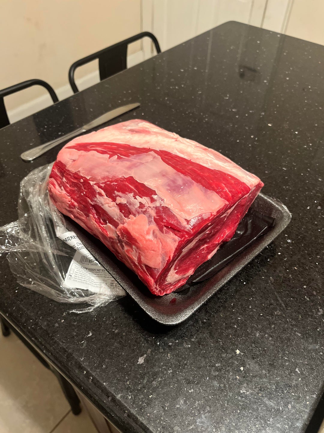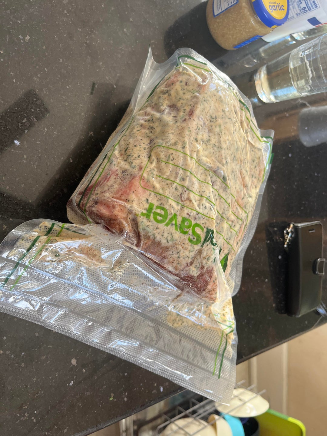 6lb Boneless Prime Rib, dry rub uncovered overnight, herb and garlic butter smear, sous vide @ 135 for 6 hours, torched the outside and poured the juices over