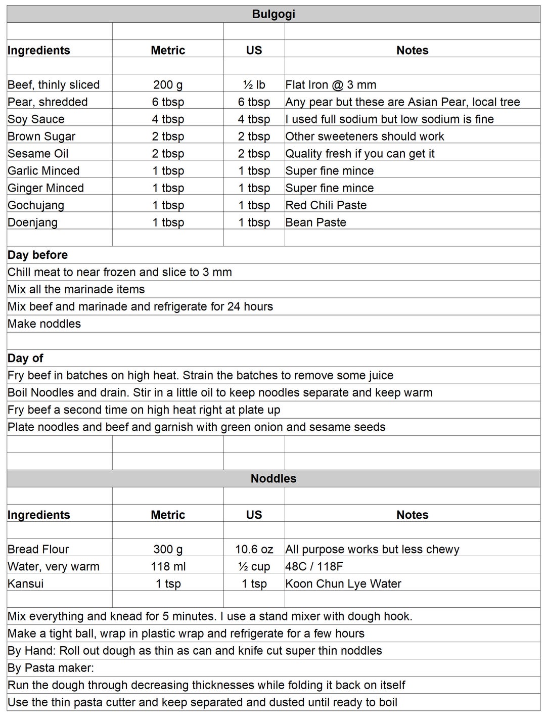 |Ingredients|Metric|US|Notes| |:-|:-|:-|:-| |Beef, thinly sliced|200 g|½ lb|Flat Iron @ 3 mm| |Pear, shredded|6 tbsp|6 tbsp|Any pear but these are Asian Pear, local tree| |Soy Sauce|4 tbsp|4 tbsp|I used full sodium but low sodium is fine| |Brown Sugar|2 tbsp|2 tbsp|Other sweeteners should work| |Sesame Oil|2 tbsp|2 tbsp|Quality fresh if you can get it| |Garlic Minced|1 tbsp|1 tbsp|Super fine mince| |Ginger Minced|1 tbsp|1 tbsp|Super fine mince| |Gochujang|1 tbsp|1 tbsp|Red Chili Paste| |Doenjang|1 tbsp|1 tbsp|Bean Paste|