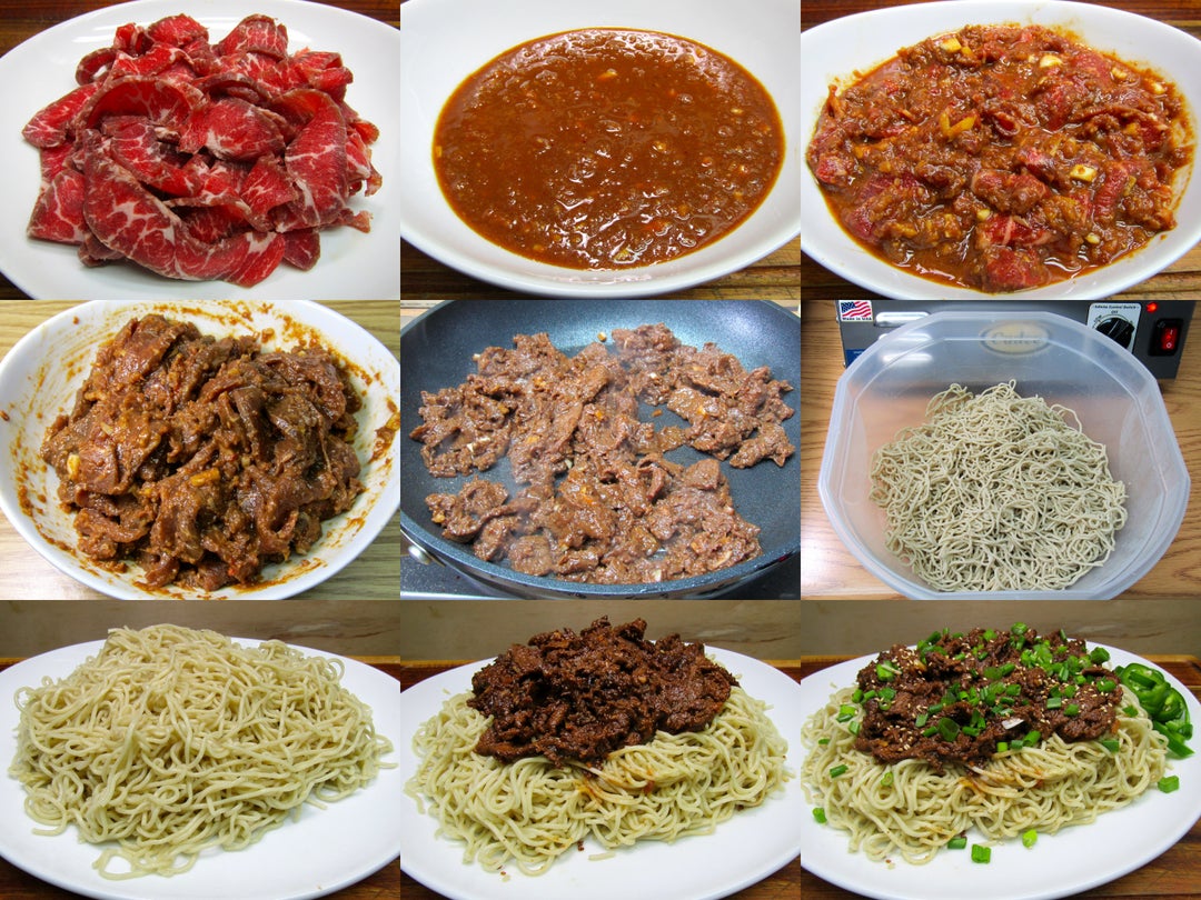 * Chill meat to near frozen and slice to 3 mm * Mix all the marinade items * Mix beef and marinade and refrigerate for 24 hours * Make noodles