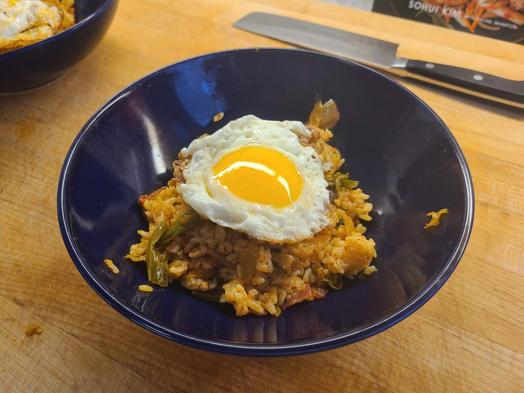 We had a friend stop in from out of town last night, and were drinking for most of the night. This morning, I separated the solids from the leftover jjigae, fried them up with bacon and leftover rice, and topped with our eggs of choice. One of the best hangover cures.