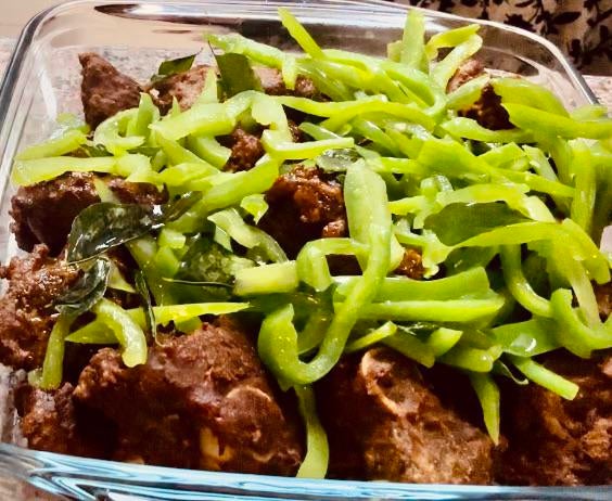 5. Sauté capsicum curry leaves green chili salt in a butter and garnish the fried mutton with the sauté veggies