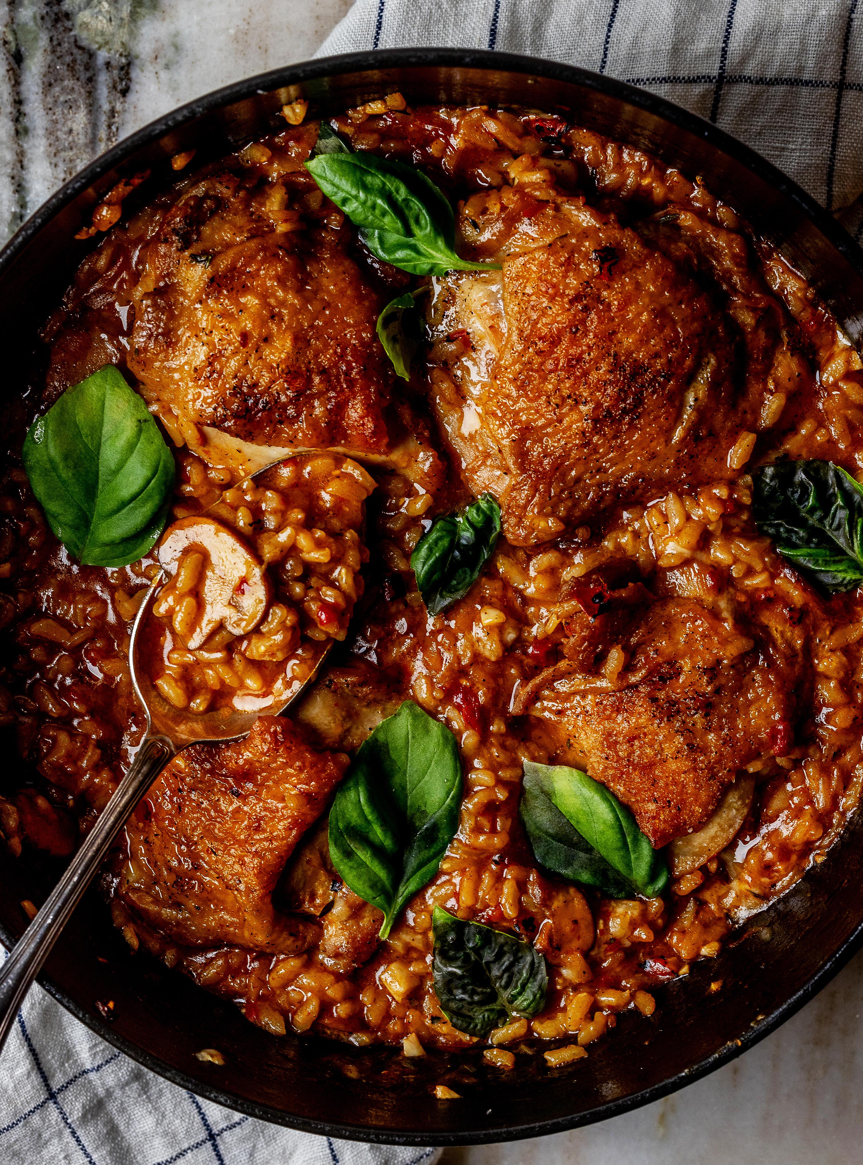 * 4 bone-in, skin-on chicken thighs * 2 teaspoons extra virgin olive oil * 1 yellow onion, peeled and diced * 6 ounces cremini mushrooms, sliced * ½ cup roasted red bell peppers, diced * 4 cloves garlic, peeled and minced * 1 teaspoon fresh thyme leaves * ¼ teaspoon crushed red pepper, plus more to taste * 1 cup arborio, carnaroli, or any short-grain white rice * ¼ cup white wine * 3 cups water or chicken stock * ½ cup freshly grated parm * Salt and pepper * Fresh basil, for serving