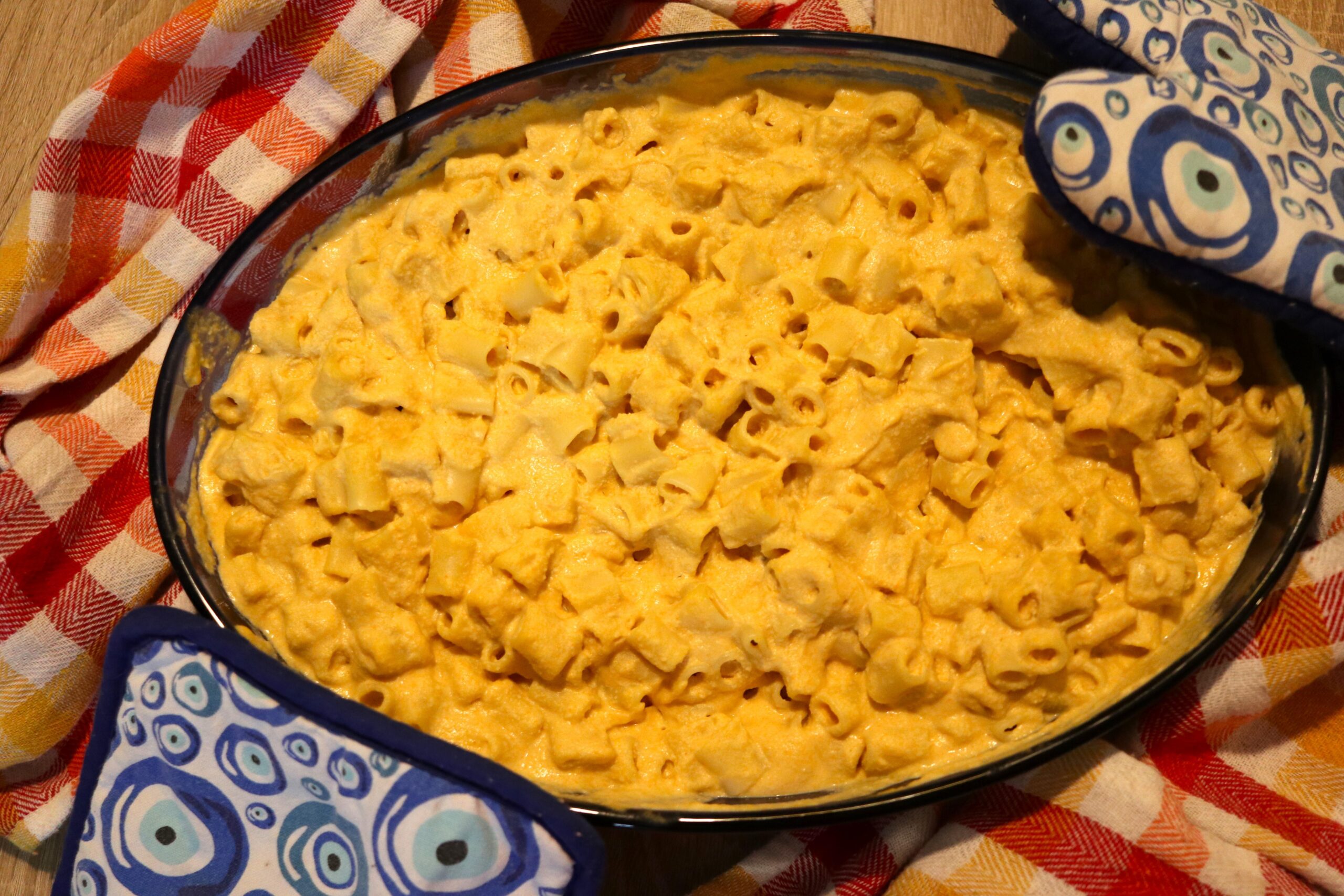 * 300g Macaroni * 250g raw cashews soaked for 24hours * 225g carrots cubed * 400g pealed cubed potato * 15 garlic cloves * 100g diced onion * 10 tbsp nutritional yeast * 11/2 tsp mustard powder * 1 1/4 cup plant milk add more liquid if you like a more runny sauce * 1/4 cup lemon juice * 225g optional vegan cheese to grate on top