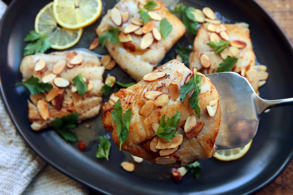 3. Reduce heat under pan to low, and add lemon juice. Stir to blend with butter and oil, then pour this sauce over fillets. Scatter parsley over cod, and scatter with toasted almonds. Serve immediately.