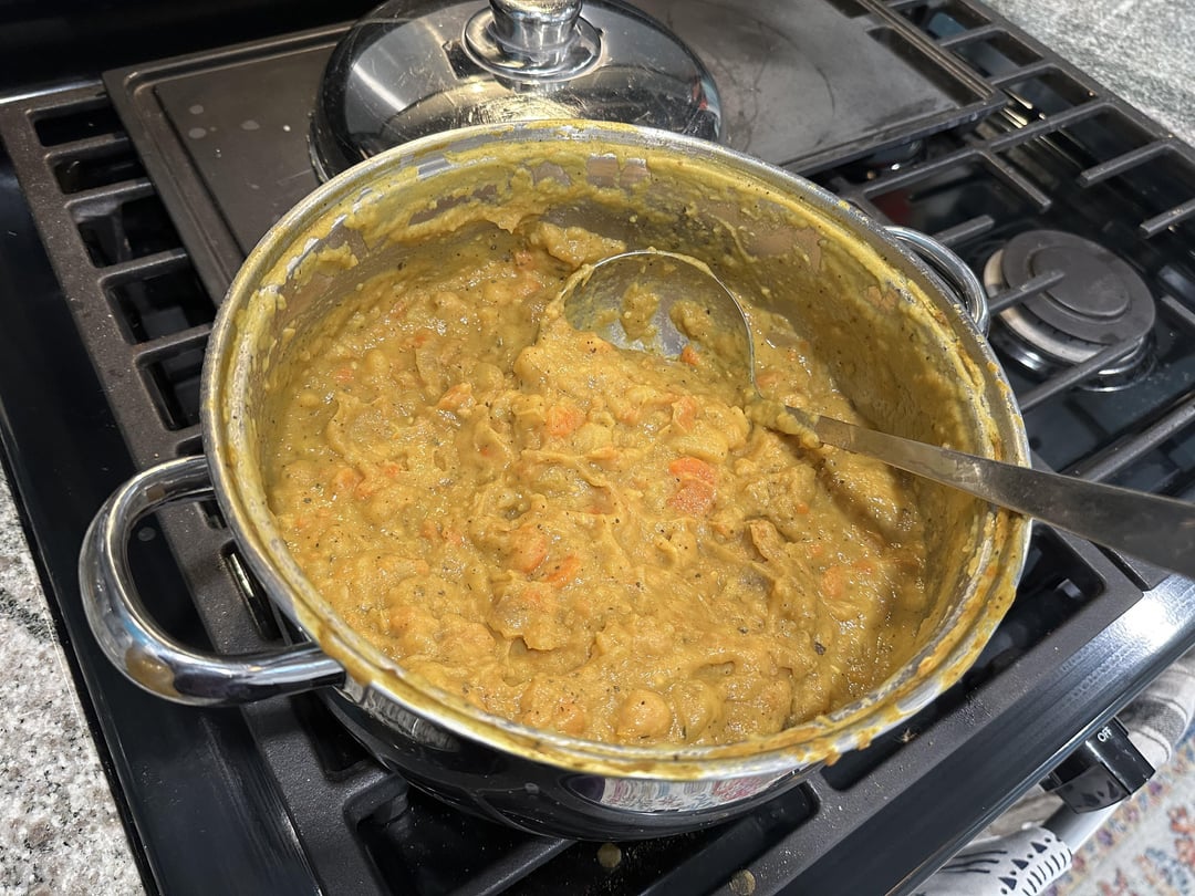 Organic russet potatoes, carrots, can of coconut cream, can of organic garbanzo beans, red onion, ginger, garlic, seasonings (curry, cayenne, garlic, onion, black pepper, salt… all your favs)
