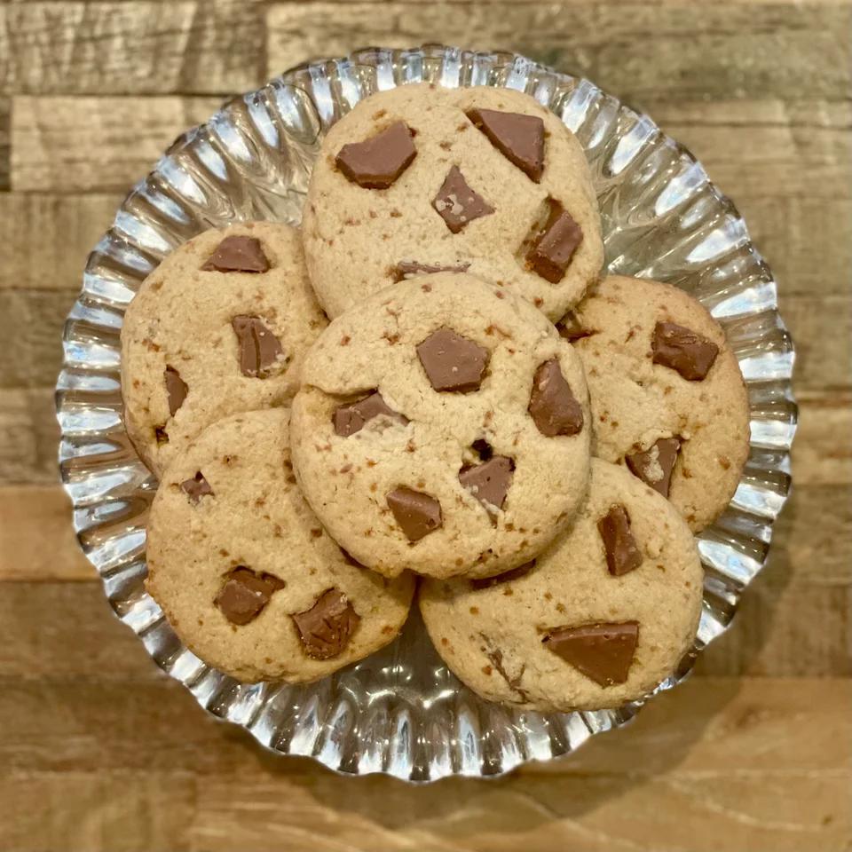 1. Preheat oven to 350°F (180°C) 2. In one bowl, cream together 3/4 cup (135g) coconut sugar, 1/4 cup (50g) granulated sugar, 1 tsp almond extract, and 3/4 cup (170g) unsalted butter (these are the wet ingredients) 3. Mix in 1 egg 4. In a separate bowl, mix together 1 3/4 cups (216g) flour, 3/4 (72g) almond flour, 1/2 tsp baking powder, 1/2 tsp baking soda, and pinch of salt (these are the dry ingredients) 5. Slowly pour and stir together 1/4 portions of the dry ingredients into the wet ingredients, until fully combined 6. Fold in 1/2 cup (50g) shredded coconut, and cut-up milk chocolate pieces 7. Line a baking pan with either parchment paper – OR – cooking spray 8. Place golf ball sized portions of dough evenly on baking pan 9. Bake the cookies in the oven at 350°F (180°C) for 10-11 minutes 10. Allow the cookies to cool for a minimum of 15 minutes before stuffing your face… or don’t lol. 11. Enjoy!