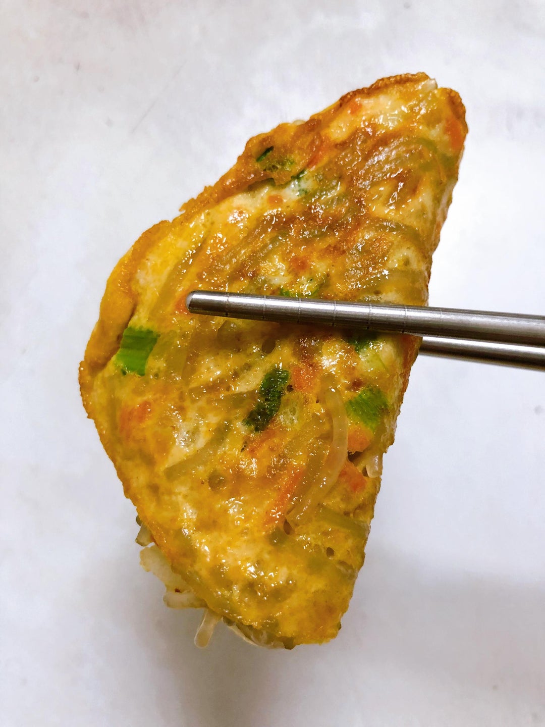 They resemble little vegetables omelettes that are folded in half. So they’re shaped like traditional Korean mandu dumplings.