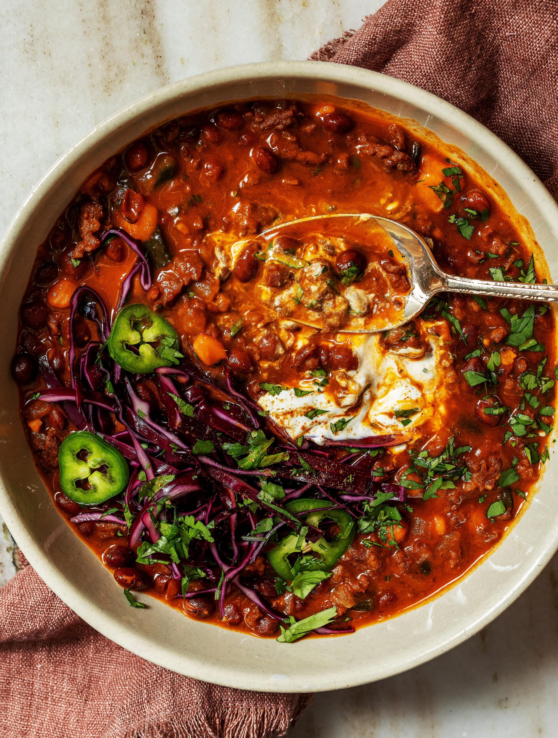 1. Ladle the chili between bowls and pile the cabbage garnish on top. Serve with a dollop of sour cream in each bowl. Garnish with more minced cilantro. Enjoy!