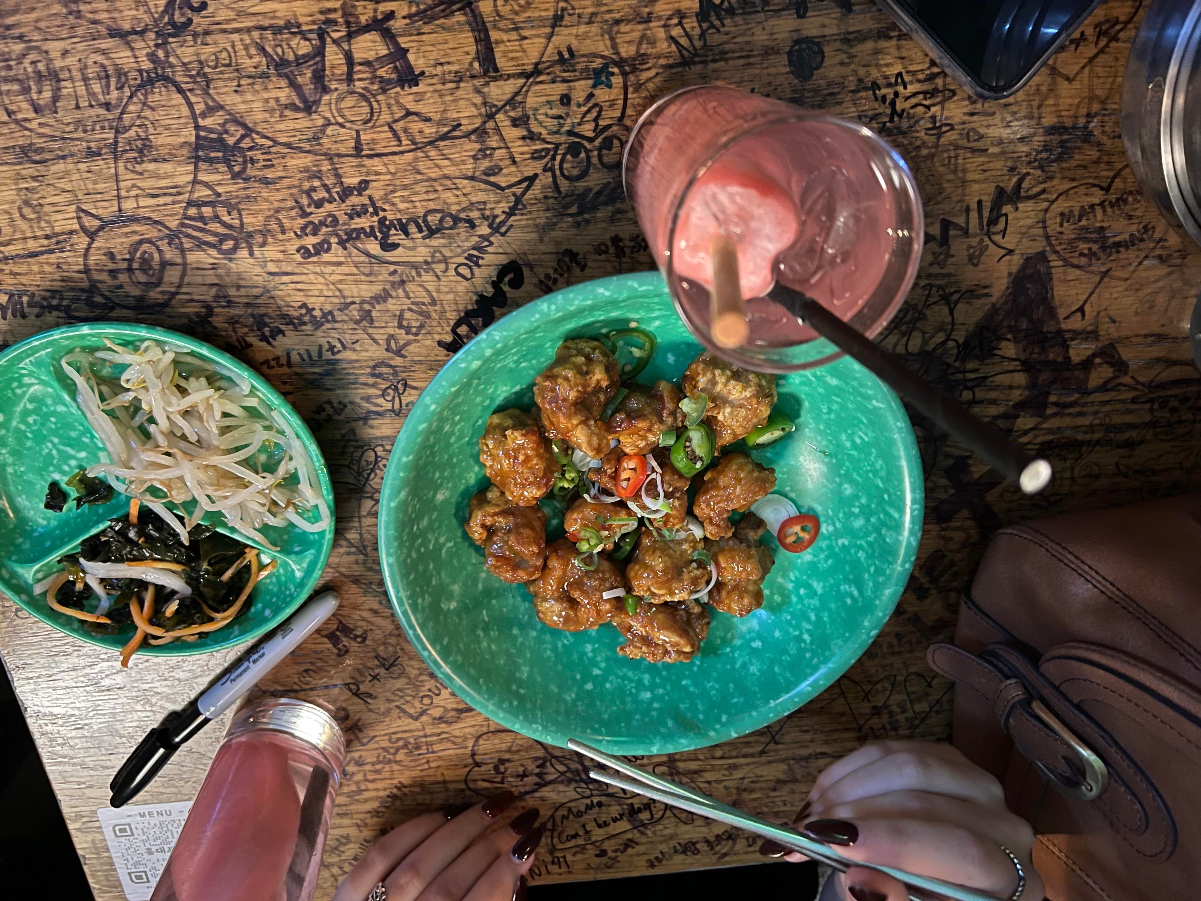 Went to this place w strawberry popsicle soju and really good hot pot !!!! Fried chicken was great too 😩 really loud music and Scribbles everywhere was a vibe, too