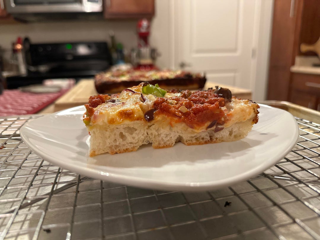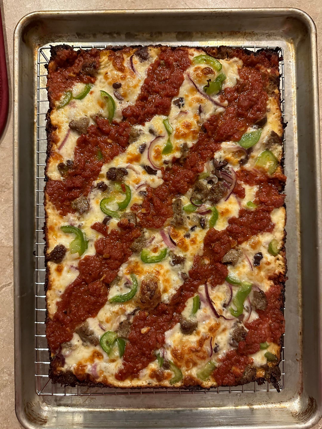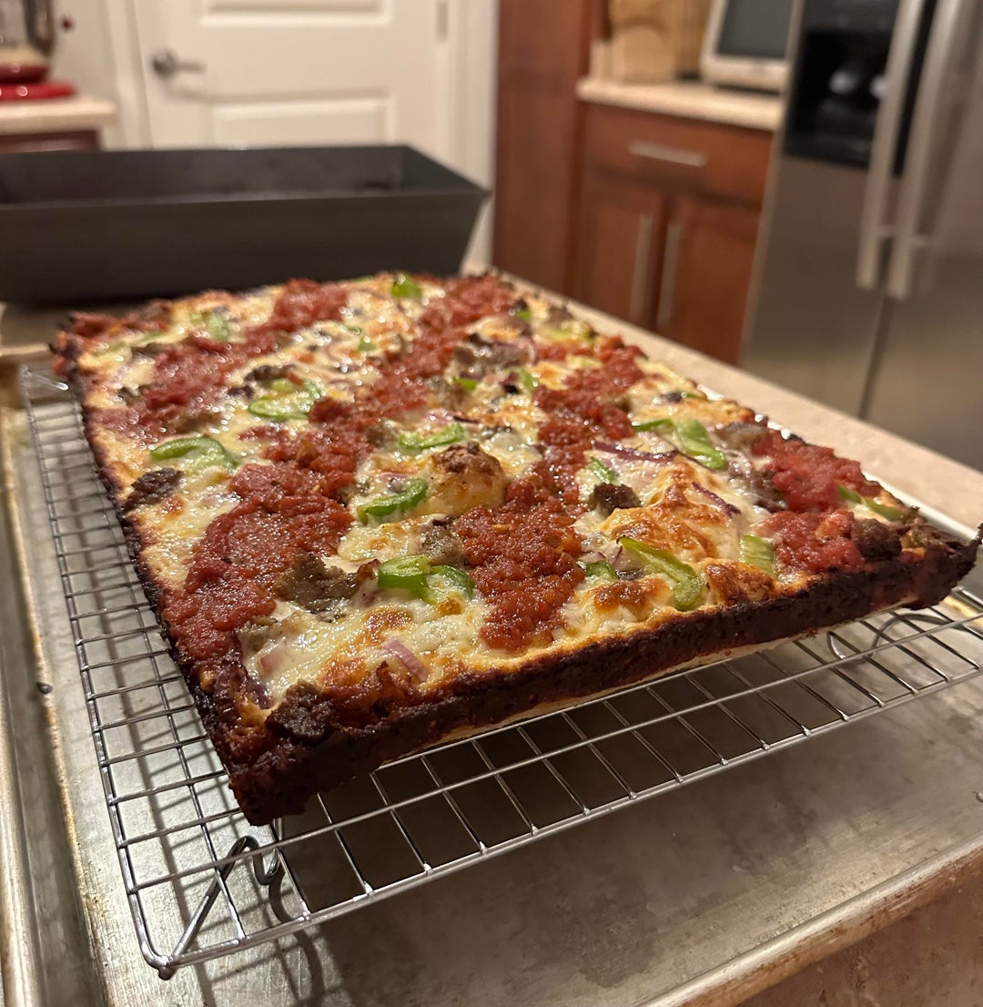 I made a green pepper, red onion, black olive, and fresh ground Italian sausage Detroit style pizza by bardezart 1 Comment SnappyDachshund 3 years ago Homemade crust?Write A CommentYou must be logged in to post a comment.