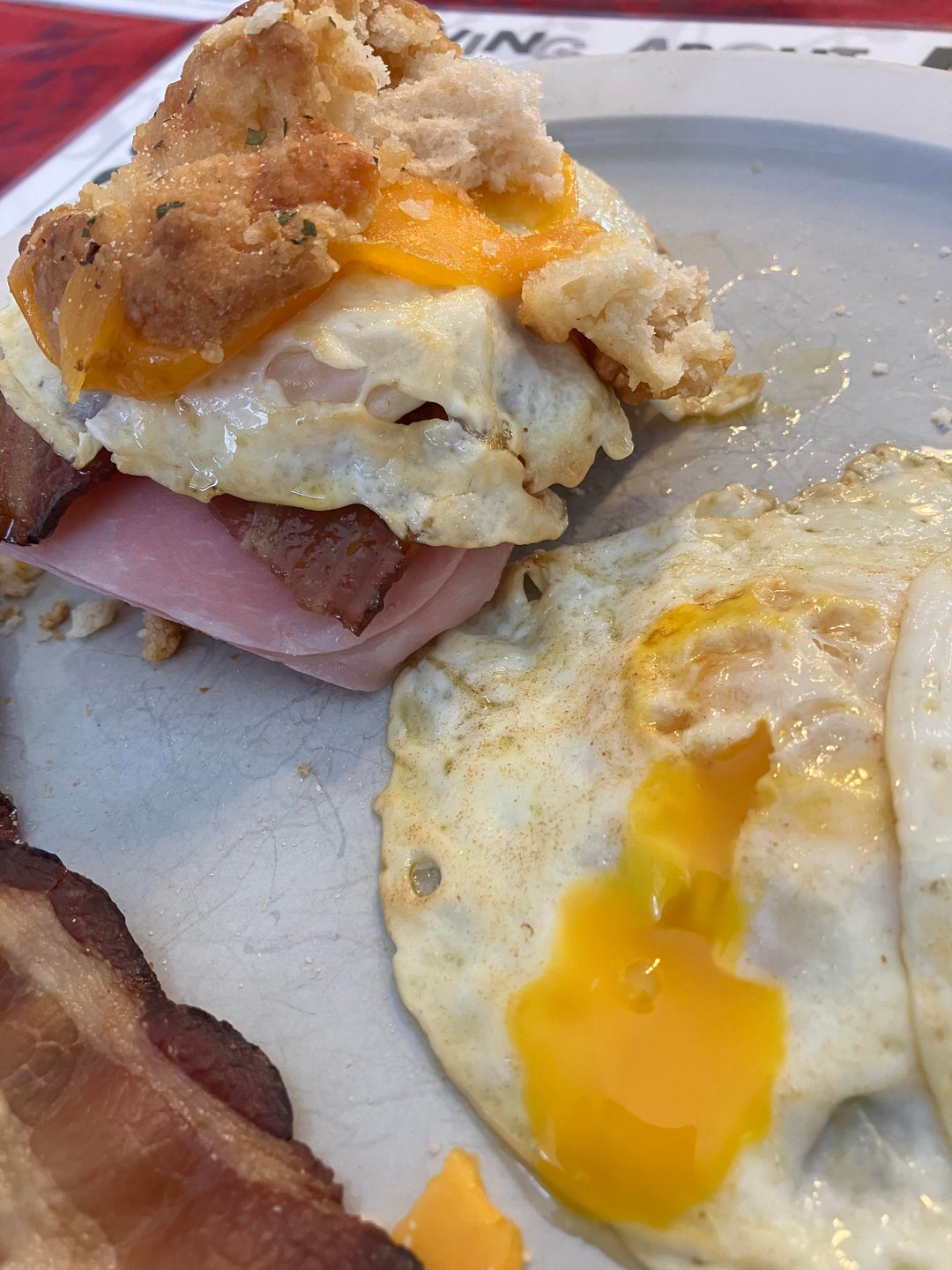 Cheddar Biscuit, with malted cheddar, ham, bacon, garlic, over-east egg plus an extra over-easy egg for yolk dipping.