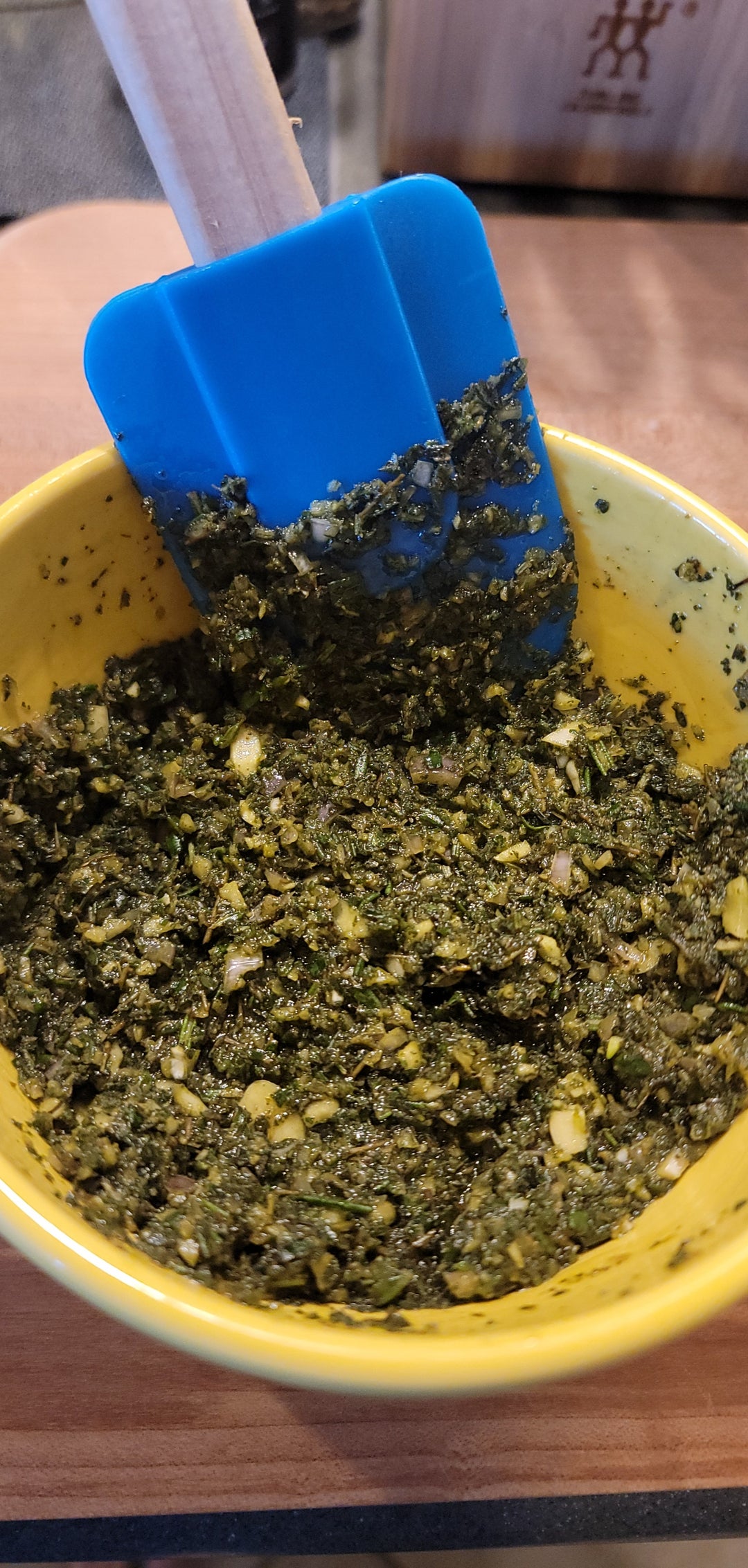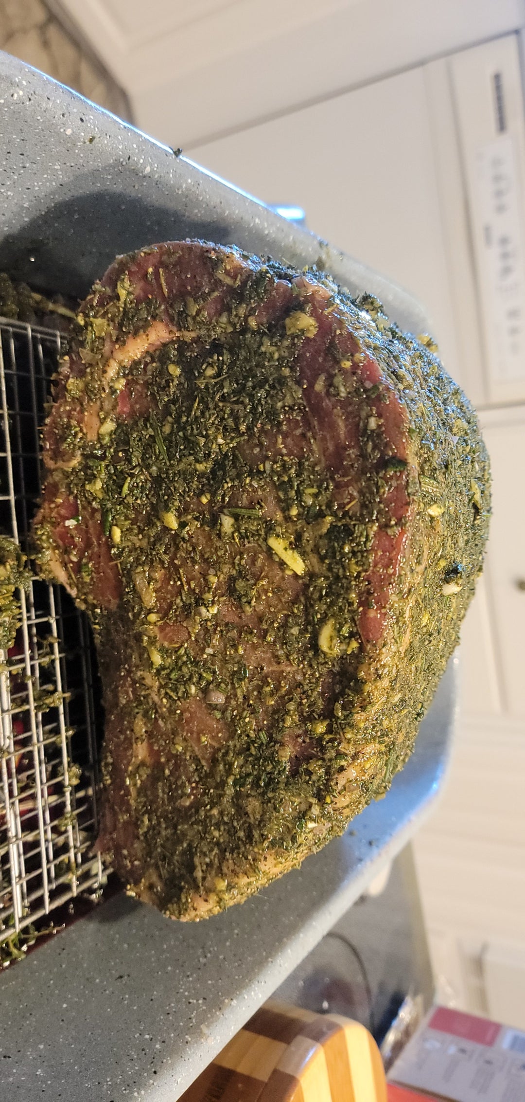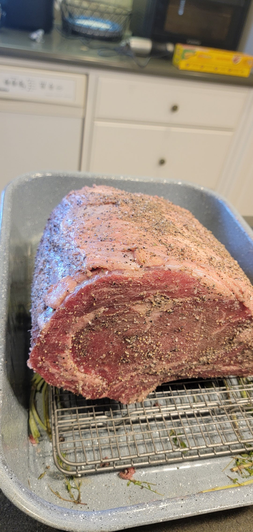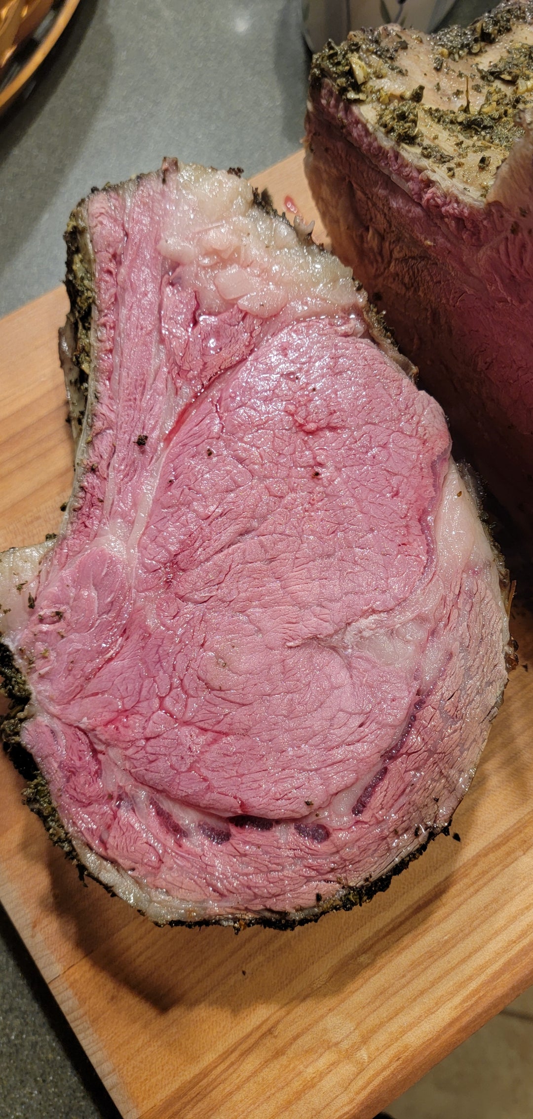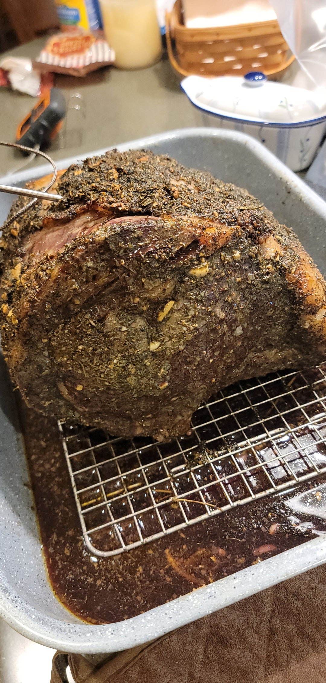 I decided to bring something nice when I visited my family for Christmas this year. Got a 3 bone choice roast from my butcher in Atlanta and loosely followed Alton Brown’s recipe. I made a blend with fresh sage, oregano, rosemary, thyme, as well as garlic and shallot + olive oil. Then, I coated the roast in olive oil, salt, pepper, and the herb blend. I also put some of the herbs and some red wine + vegetable broth in the bottom of the pan to make the juice.