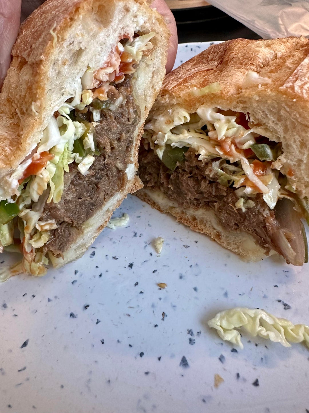 Chimi sandwich. Pernil, cabbage,Swiss, jalapeños, green peppers, onions, ketchup and mayo. by nooyork Write A CommentYou must be logged in to post a comment.