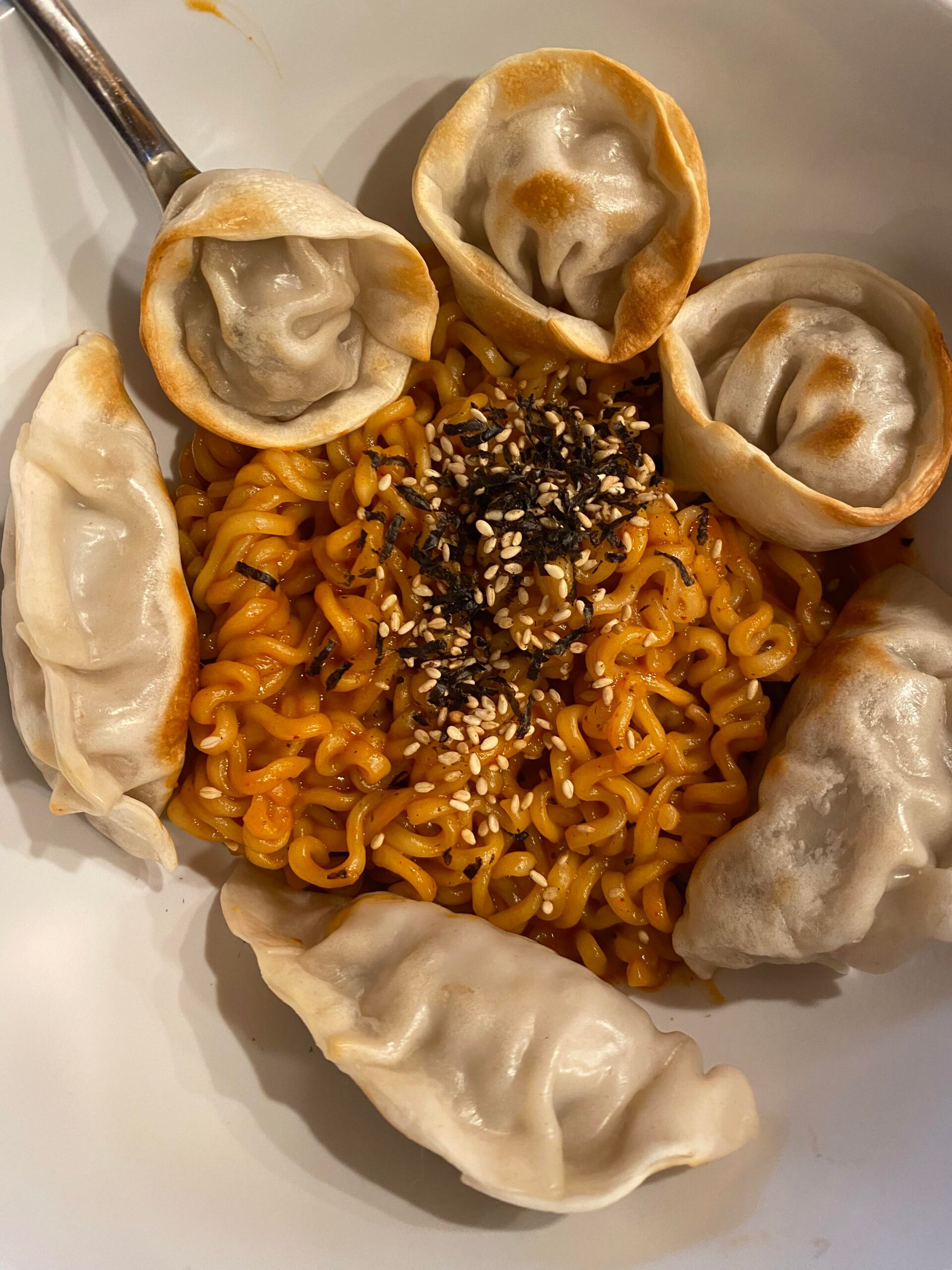 Air-fried some leftover New Years mandu and added it to a bowl of Buldak ramen (with a spoonful of peanut butter stirred in as well) for a hastily-made quick lunch. Didn’t know what to expect, but actually it wasn’t too bad. Please don’t report me to r/stupidfood lol.