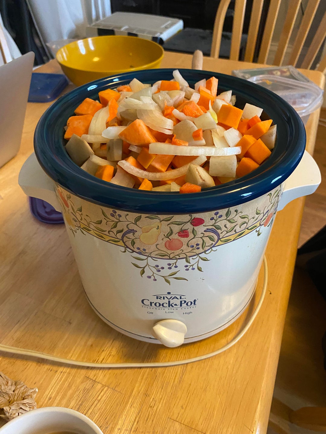 3cheers4nantucket 3 years ago Recipe: 5 or so hours on high1 pound ground beef1 pound stew beef2.5 cups beef broth1 big onion4-5 cups potatoes (mix of sweet and russet)2 cups butternut squash dicedCup of carrotsSplash of peasThymeRosemary