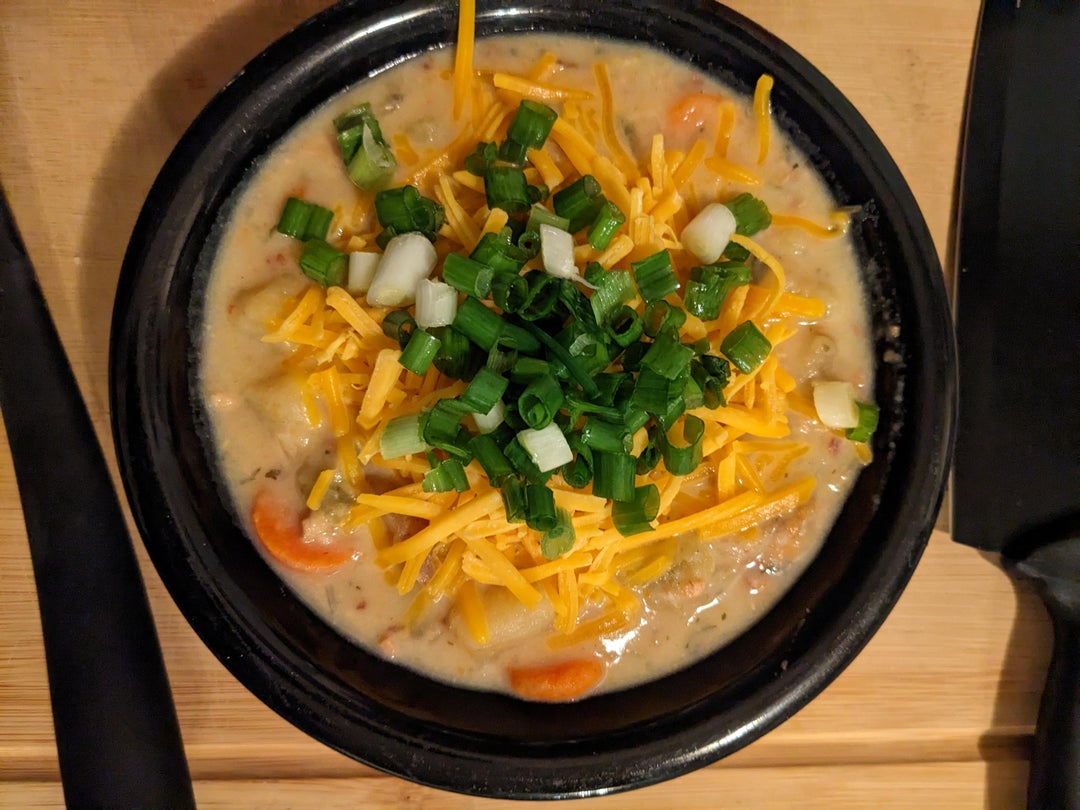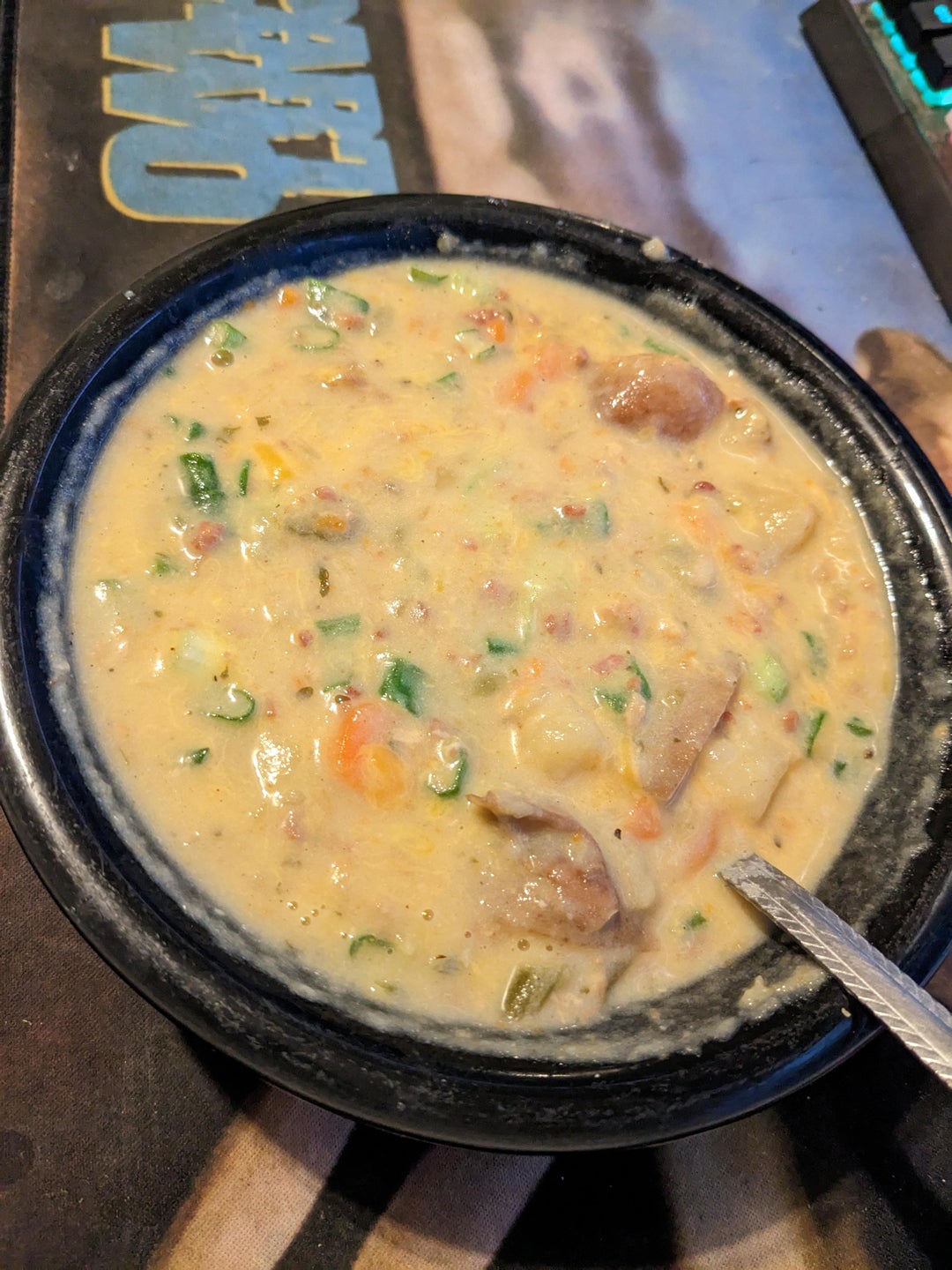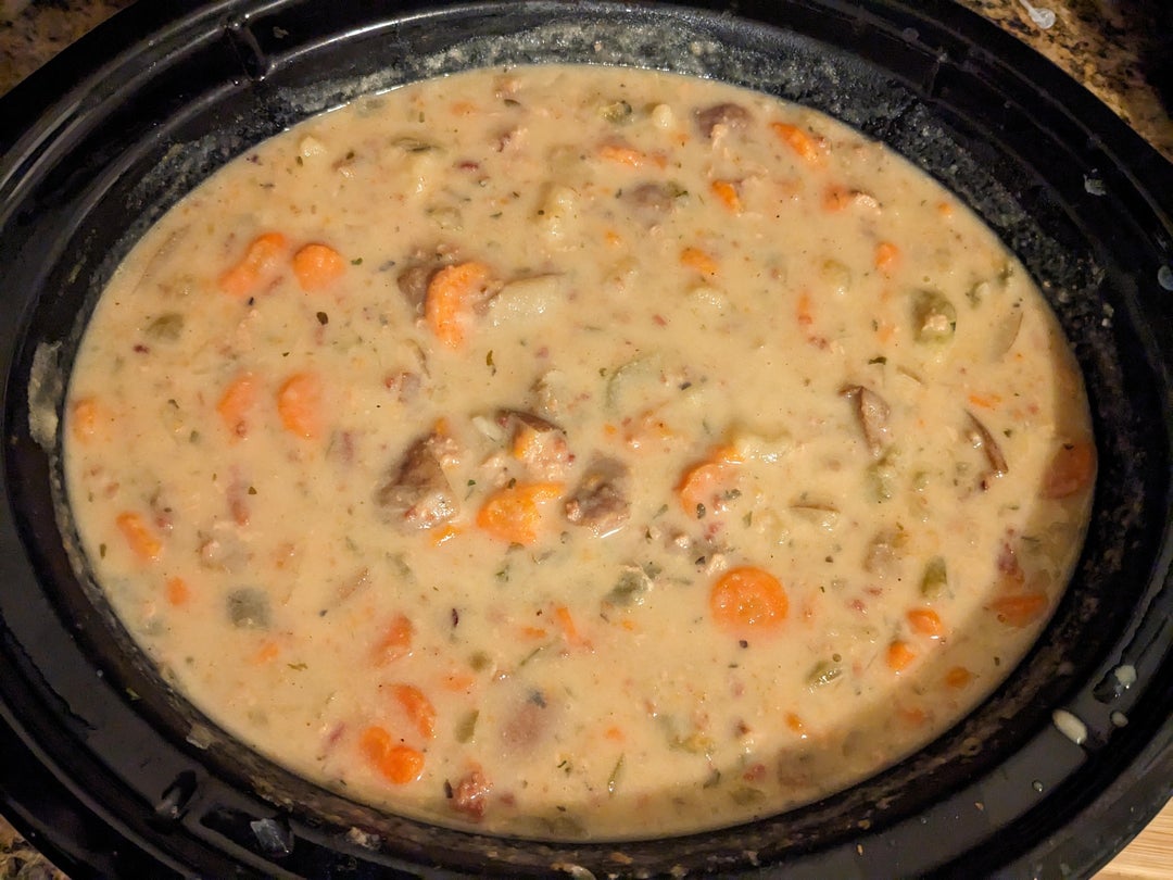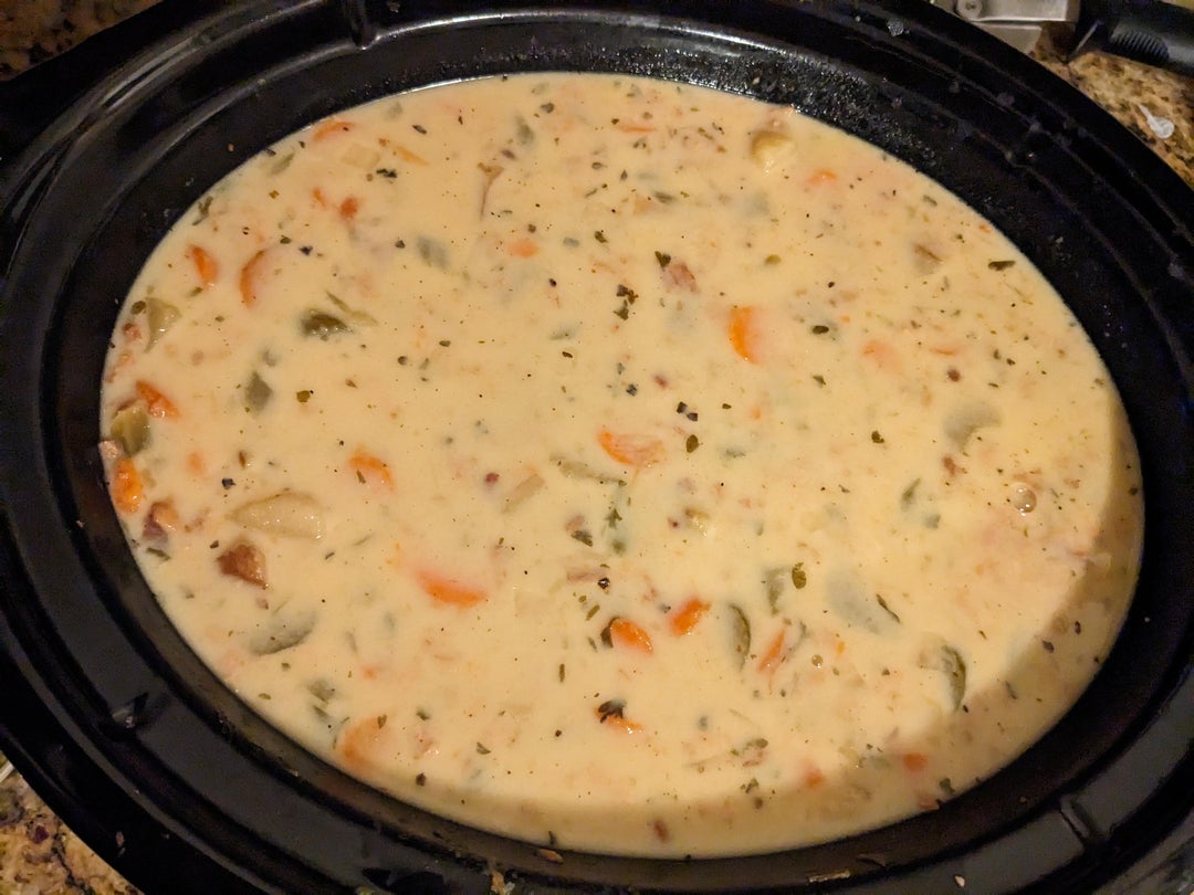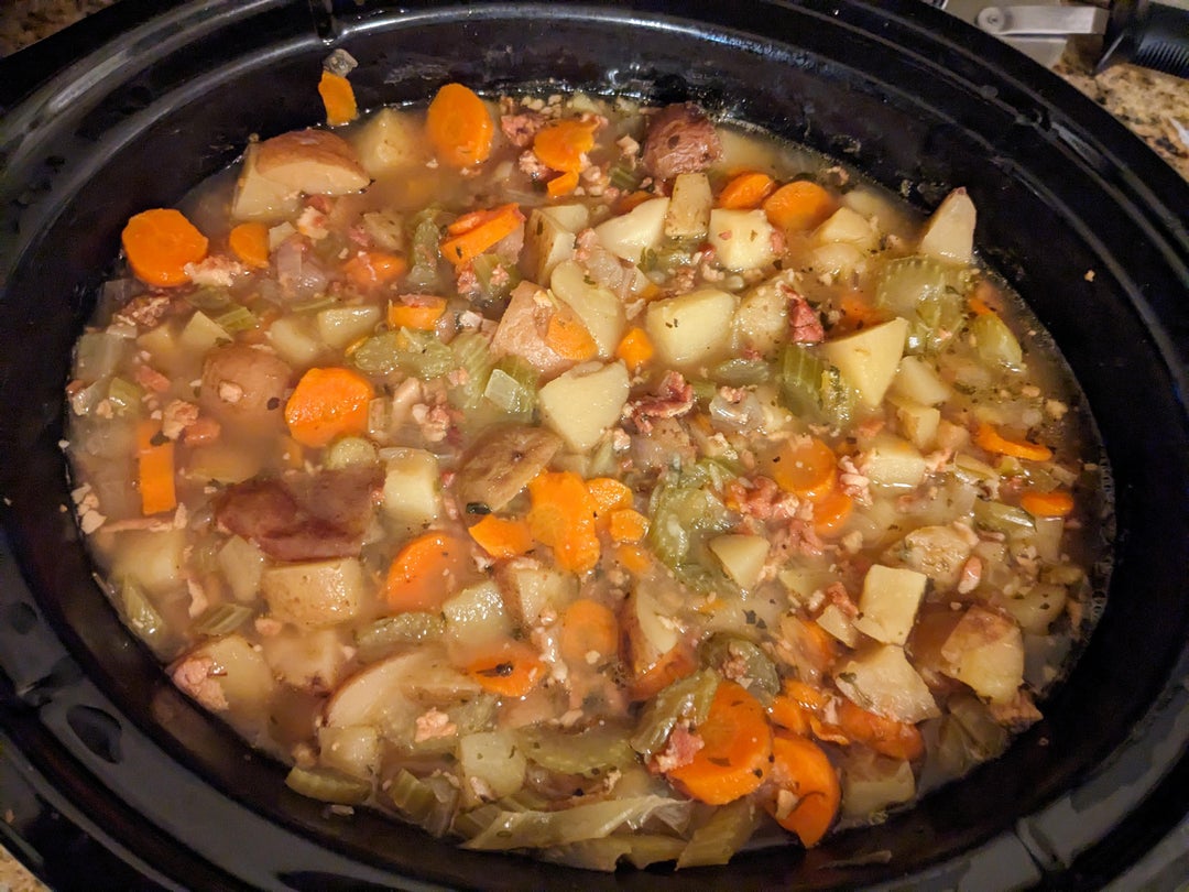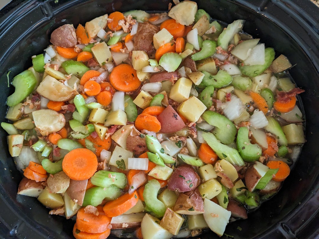It’s pretty much [this recipe](https://www.reddit.com/r/slowcooking/comments/pym7sd/comment/hev0di5/?utm_source=share&utm_medium=web2x&context=3) but with 1lb carrots & 1lb celery added (and even more potatoes)! I also used a white onion instead of yellow and there are 2 packets of bacon bits in here. Next time I think I’ll add broccoli too 🤤