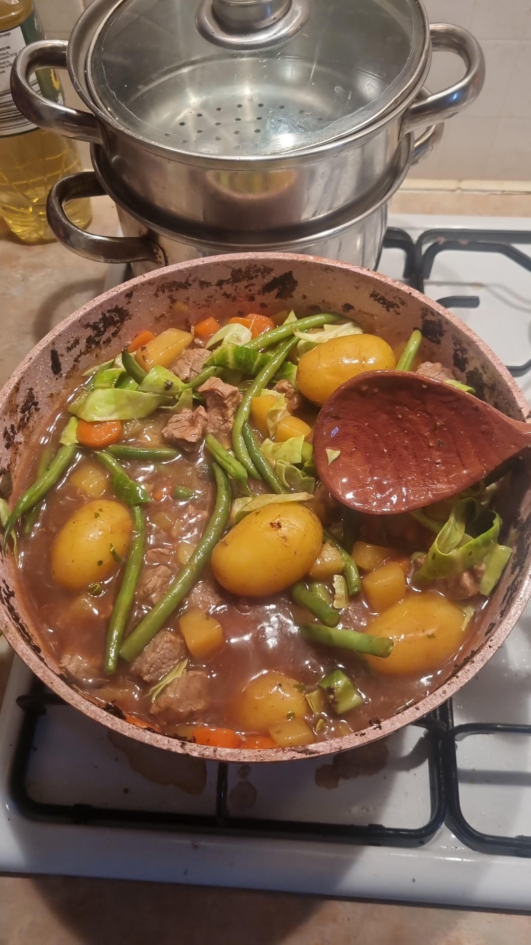 Simmer your chosen veg and diced beef for an hour and then add the softer/more fragile veg later and simmer for another 20 mins.