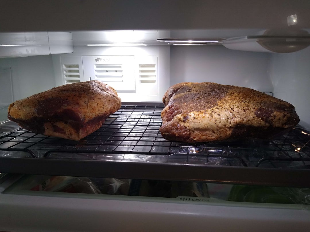 * 24hr dry-brine/rind/however you want to call it – take it out of the vacuum seal, pat it down with paper towels, and then put it in the fridge with adequate airflow (in this case I used a cooling rack on a baking pan) for 24hrs.