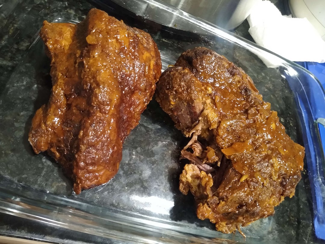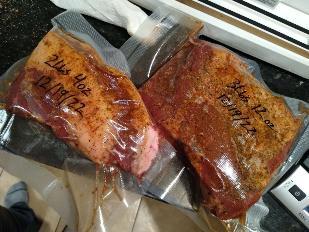 * Dry rub & vacuum seal – in this case, mine sat for 11 days, but I think after the first ~2 you’re probably good to go. If you don’t have a vacuum sealer that’s fine, you can tightly plastic wrap it or just go straight to dry brining. The goal is to just give the dry rub some time to soak in as opposed to going straight into the crockpot.