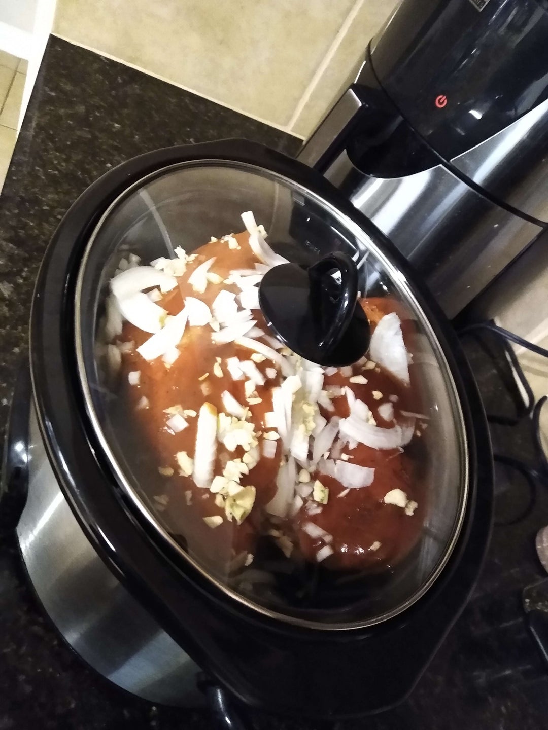 * Slice your onion and obliterate your garlic. Add some sliced onions to the bottom of the crockpot for the meat to sit on top of to get some space for the sauce to flow and move around the bottom of the meat, and then go ahead and add the meat and everything else to the crockpot.