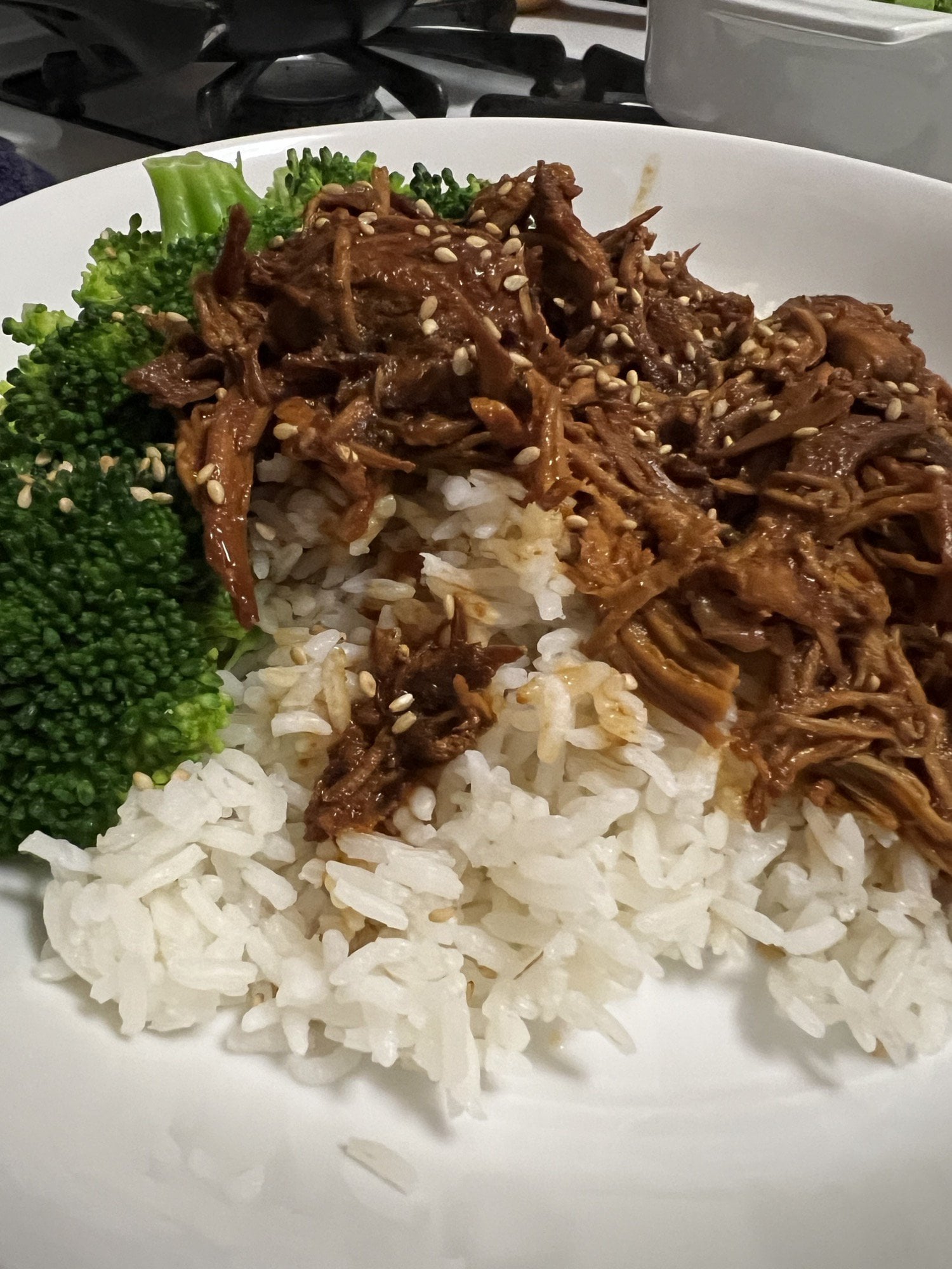 Shredded it up and served with rice and broccoli, with some sesame seeds on top.