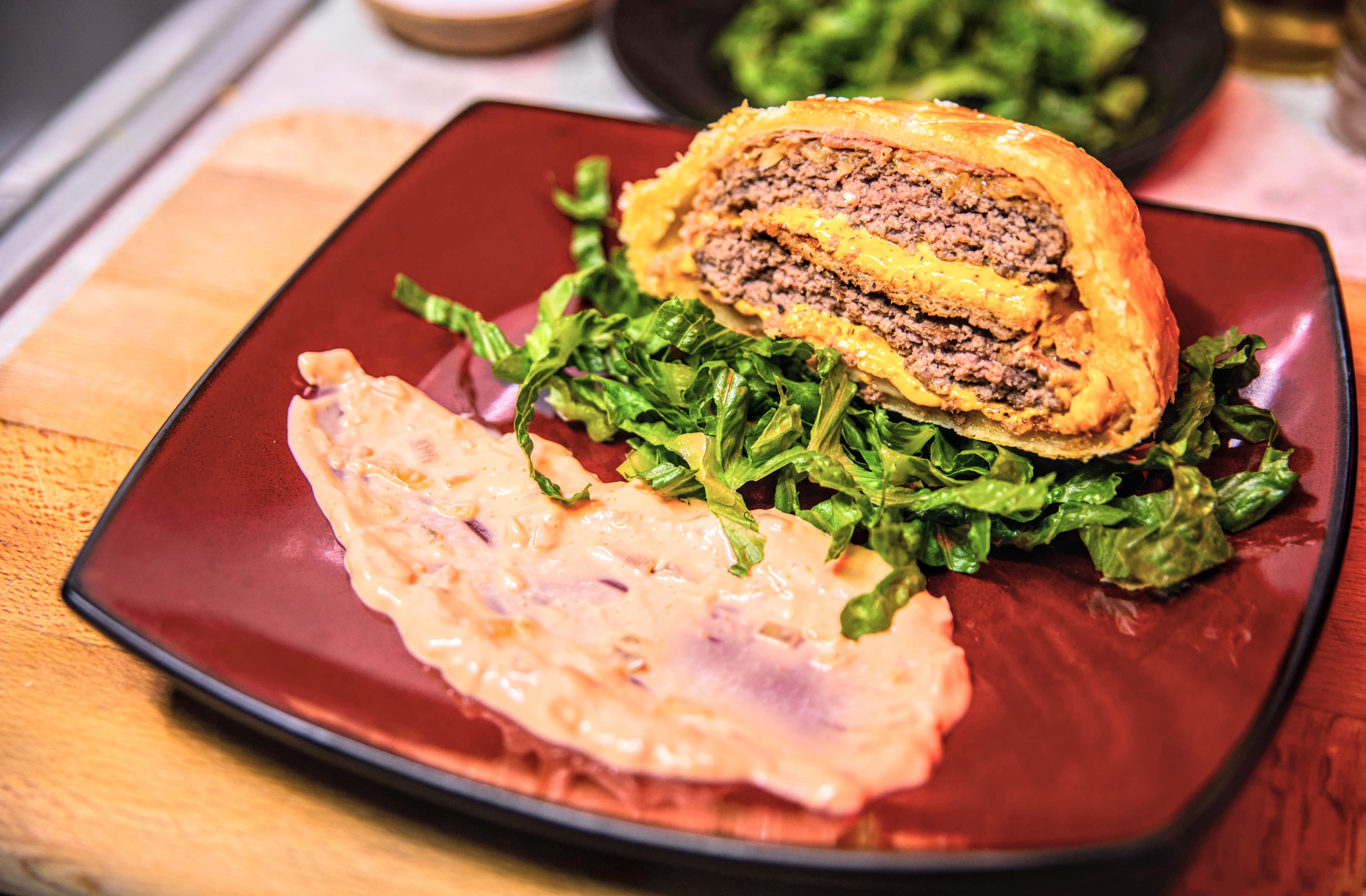1. Dice your onion, put into a pan at low heat. Caramelize your onions from 1-4 hours, depending on how much time you have. The jammier the onion, the better! 2. Let’s make our sauce. Combine the ketchup, mustard, mayo, relish, salt & pepper, (optionally) some garlic powder, and some of your caramelized onions. Technically Big Mac sauce, as I learned, doesn’t have ketchup in it, but it tastes better that way in my opinion! You can also omit the mustard, and it’ll still be a classic burger sauce. 3. Toast your middle piece of bread. It’s okay if you over-toast it, as it’ll be holding the fort in the center of our big mac wellington. 4. With your ground beef, separate it until you have ¼ lbs beef patties. Roll them into balls, place on parchment paper, then smash into disks. Cook them on medium high, don’t forget to season! Set aside. 5. Once your patties are cooked, lay out a sheet of cling wrap and lay down your blanket of prosciutto. Assemble your “big mac” here, adding onions, sauce, patty, cheese, center bread, patty, cheese, sauce, and wrap it in the prosciutto as tightly as you can. Put in your fridge to rest for 30 minutes. 6. Now, wrap everything in your puff pastry as tight as possible. Place them on your tinfoil lined baking sheet, brushing with egg wash, and topping with sesame seeds. 7. Bake for 15-20 minutes at 400F 8. Serve on a shredded bed of lettuce with a sauce swoosh on the side. Enjoy!