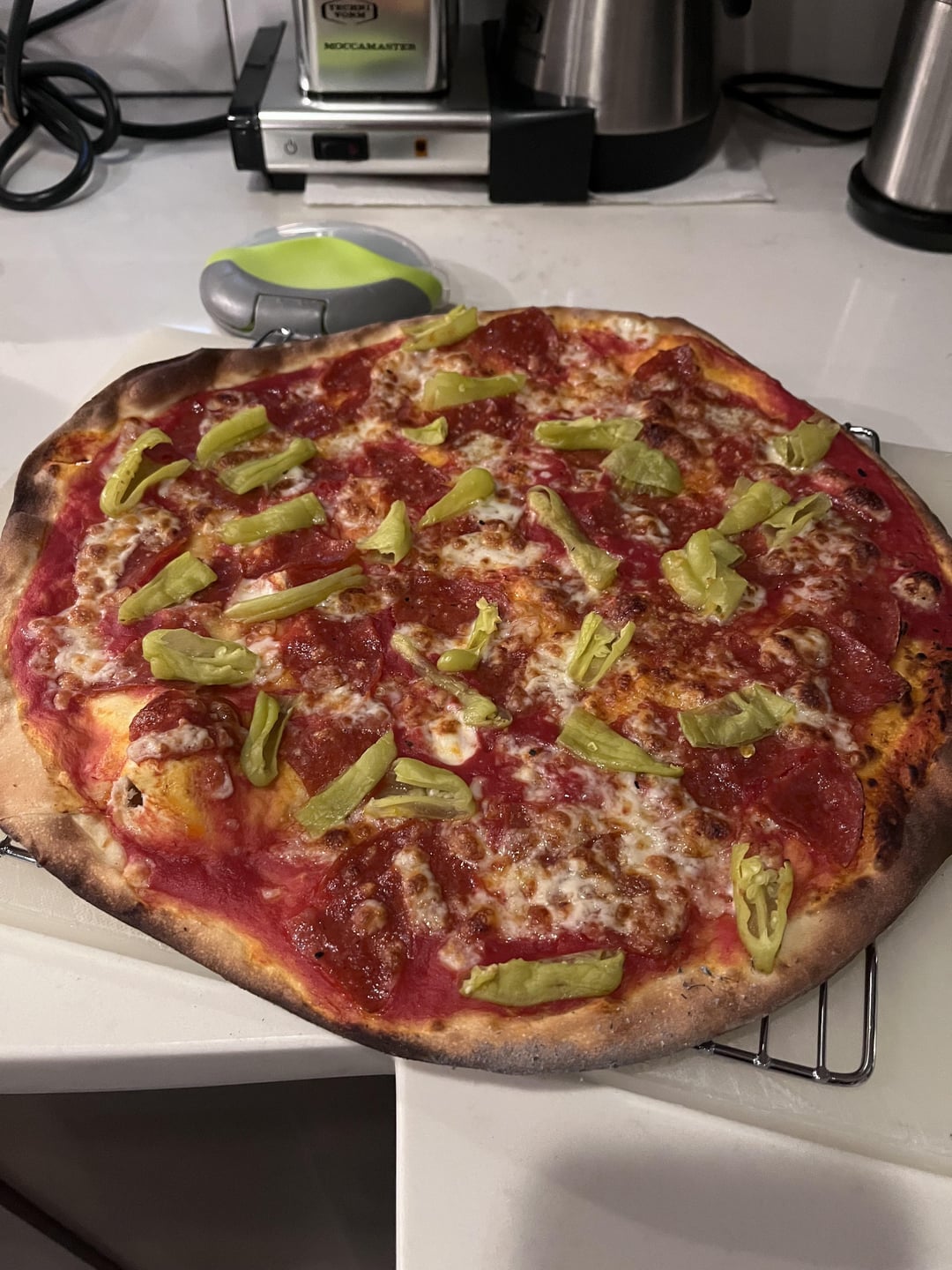 Pie 1: low moisture 🤌🤌 pepperoni, and pepperocini.