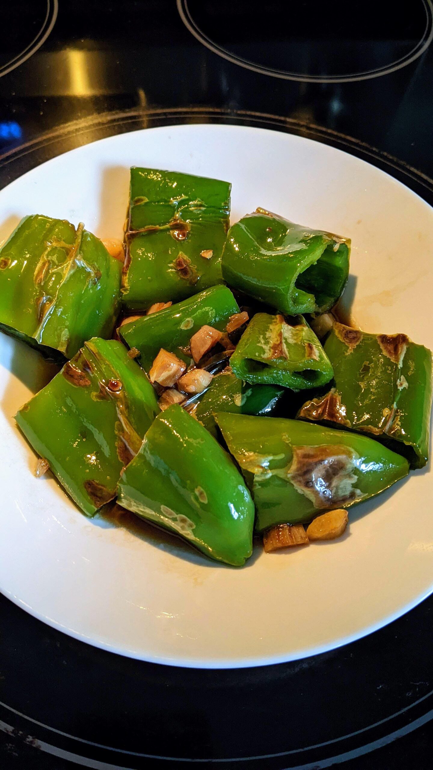 Tiger skin peppers is a popular Chinese homemade dish. The peppers are pan-fried (dry pan, no oil) and those charred spots look like “tiger skin”. In this dish, the peppers taste just a little bit spicy and sweet with a soy sauce and oyster sauce based flavor.