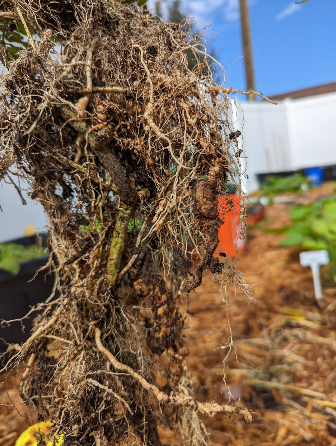 Needed room for some potatoes to be seeded, so I uprooted the plant (since it wasnt showing any new growth). Tomato roots are so interesting! They took up a lot less of the container than I expected, most of the roots were clumped nice and tight.