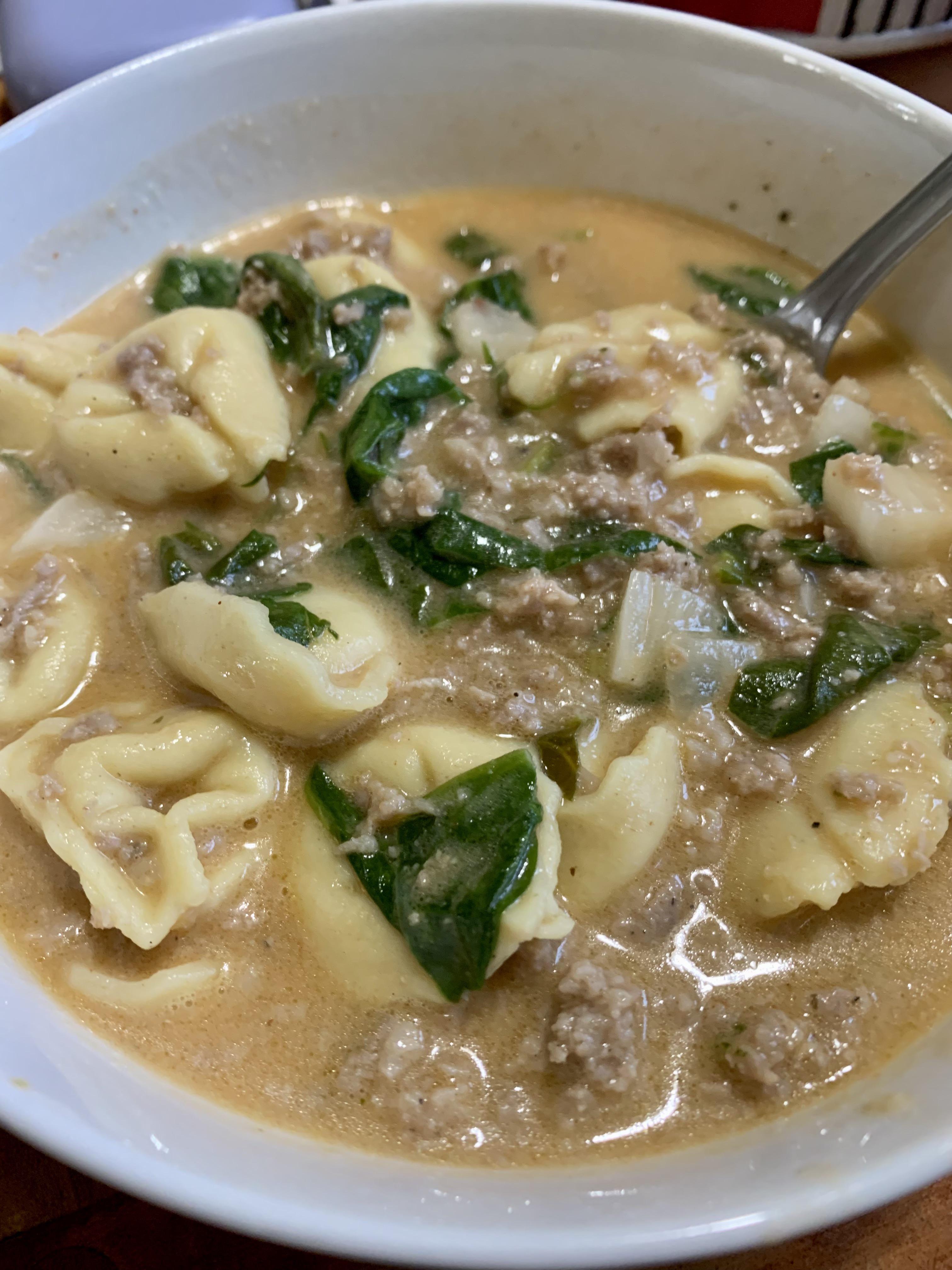 The soup. Here’s what I did. Used low sodium pork sausage, 2 cup of reduced sodium chicken stock, used Mrs. Dash table blend. Mixed the Parmesan cheese in the heavy cream and added that with the gluten free tortellini in the last hour of cooking. Way better flavor.