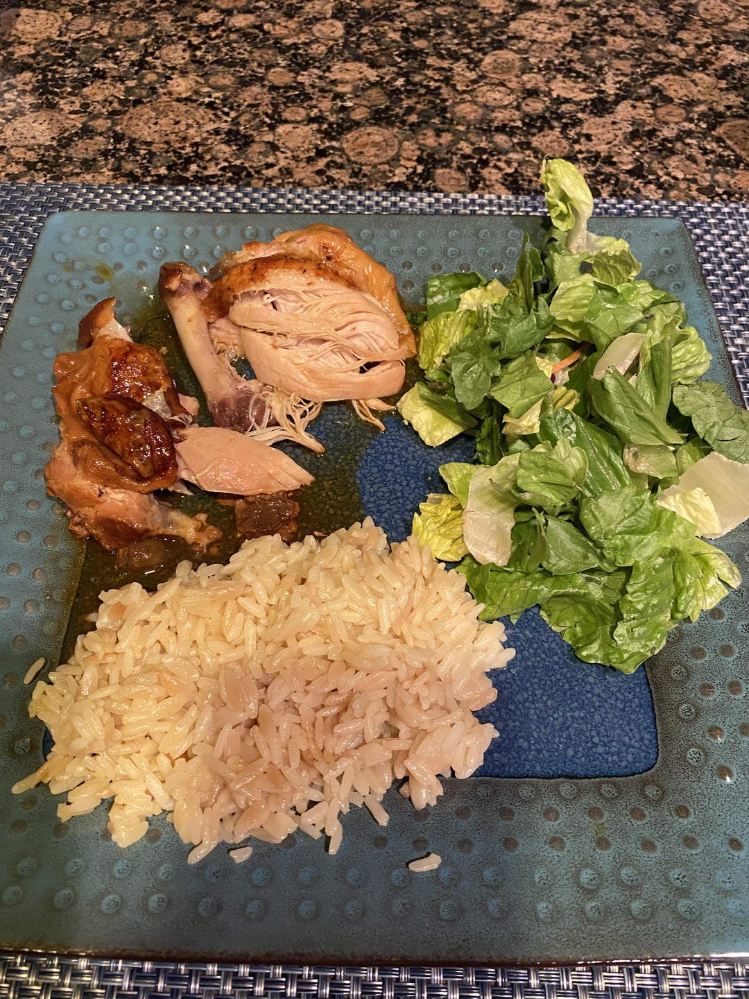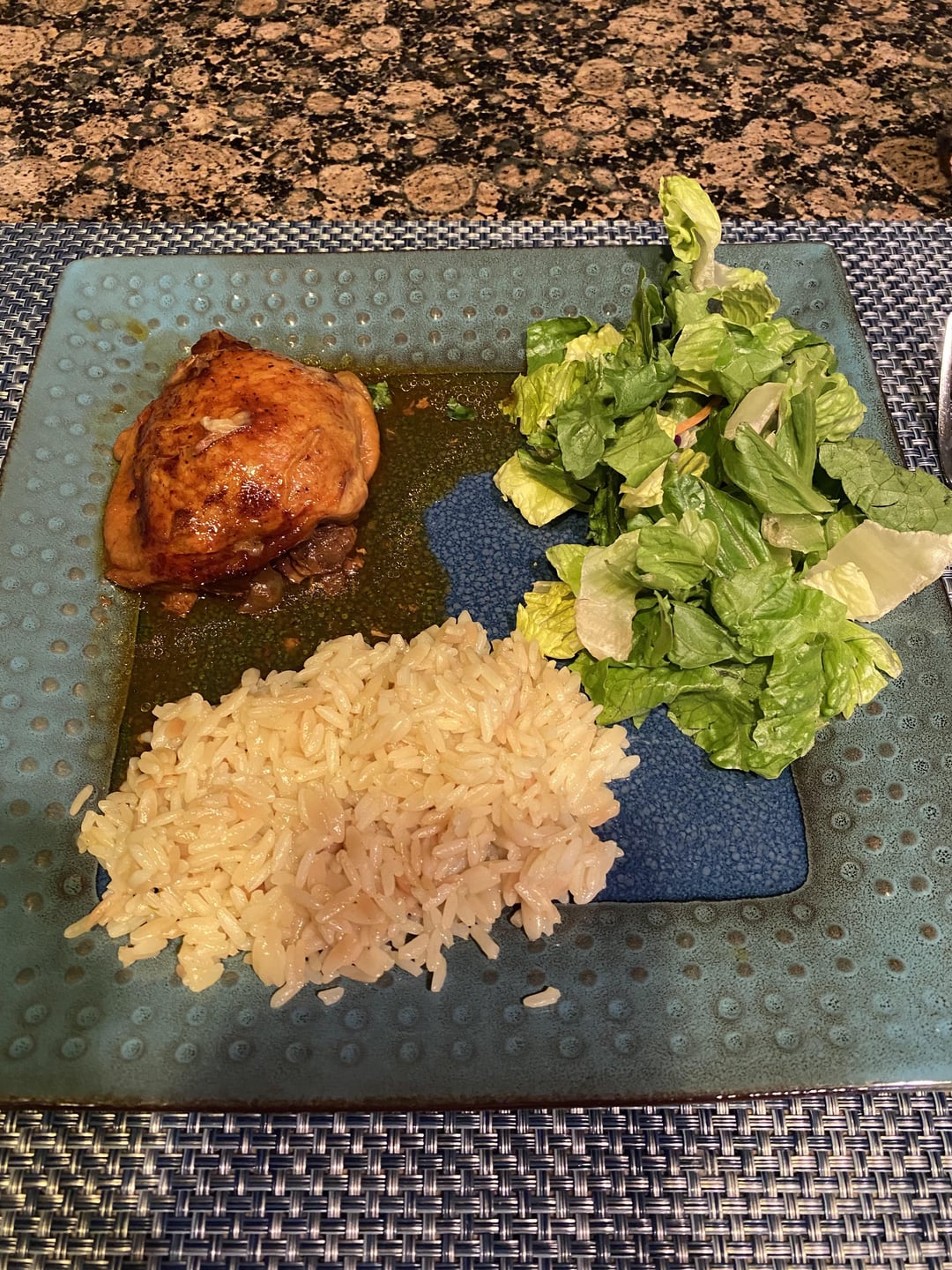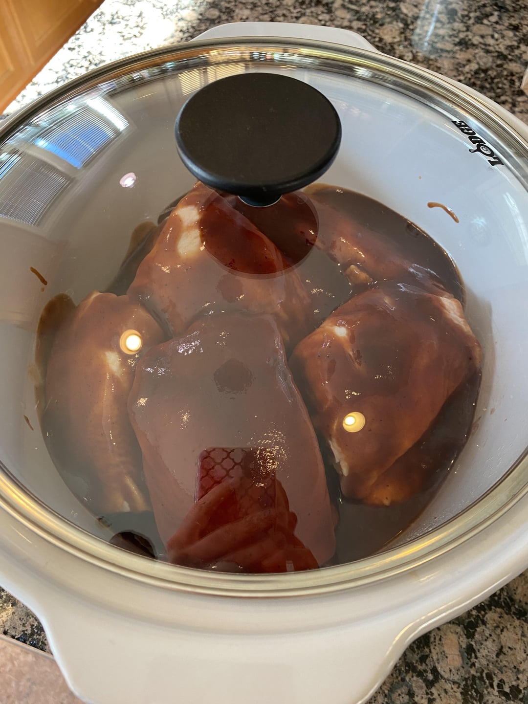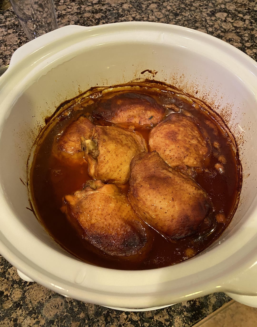 Might not be the prettiest meal but super easy and always gets a great response when we serve it to guests. Always fall-off-the bone tender. We’ve made this with 4 chicken thighs, today was 10 thighs, and we’ve made everything in between. Usually we do about 1/4-1/2 bottle of BBQ sauce, but I’ve also used a whole bottle. Can’t really go wrong. Also add hot sauce for an extra kick. Such an easy meal and a life saver postpartum!