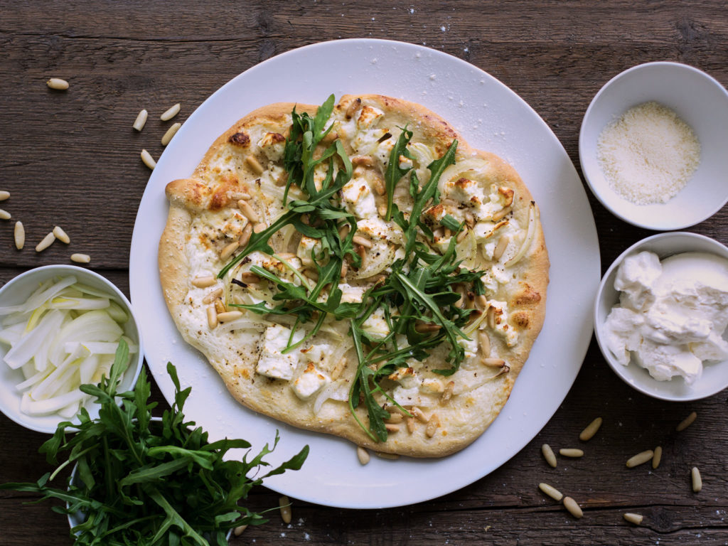 Place dough on a lined baking tray. Spread crème fraîche evenly over dough. Sprinkle with pine nuts, feta, and onions. Grate Parmesan on top with a fine grater. Place in the oven and bake at 220°C/425°F for approx. 10 – 15 min.