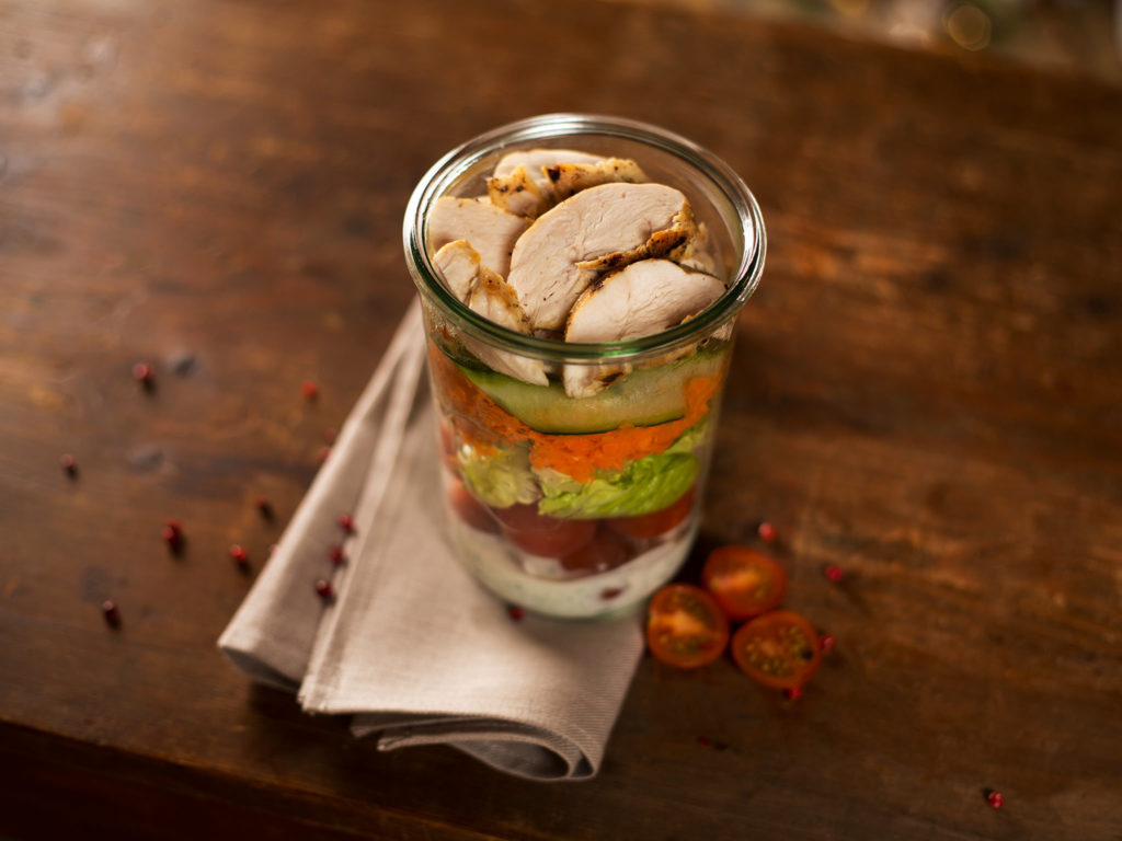 Tear lettuce into pieces. Slice chicken into strips. Spoon dressing into bottom of jar. Layer cherry tomatoes, olives, half of the lettuce, carrot, cucumber, and bell pepper. Top with the rest of lettuce and chicken. For serving, add all ingredients to a bowl and stir well to combine. Enjoy!