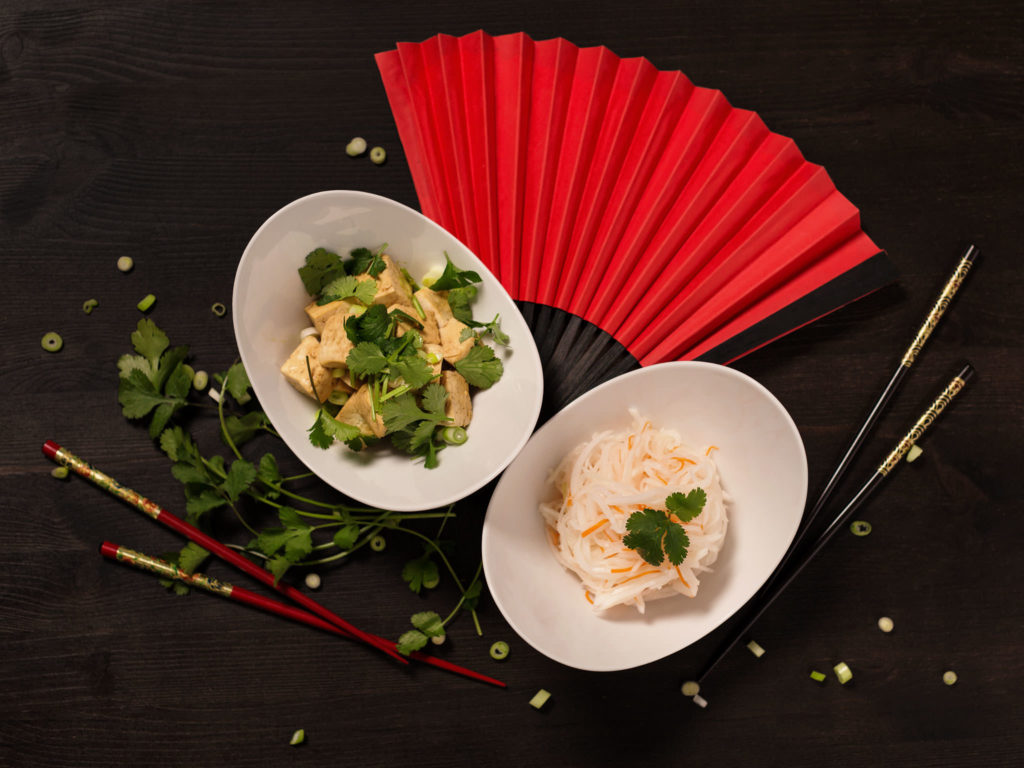 Cut radishes and carrot into fine strips. Finely slice spring onions, roughly chop the cilantro. Cut tofu into cubes.