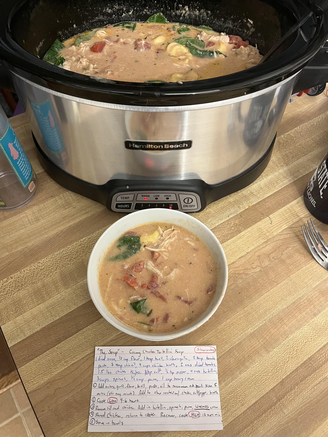 5. On a cutting board, shred or cut the chicken into bite-size pieces. Add the chicken back into the slow cooker. Put the lid back on and cook on HIGH for about 10 more minutes, or until the tortellini are cooked through.