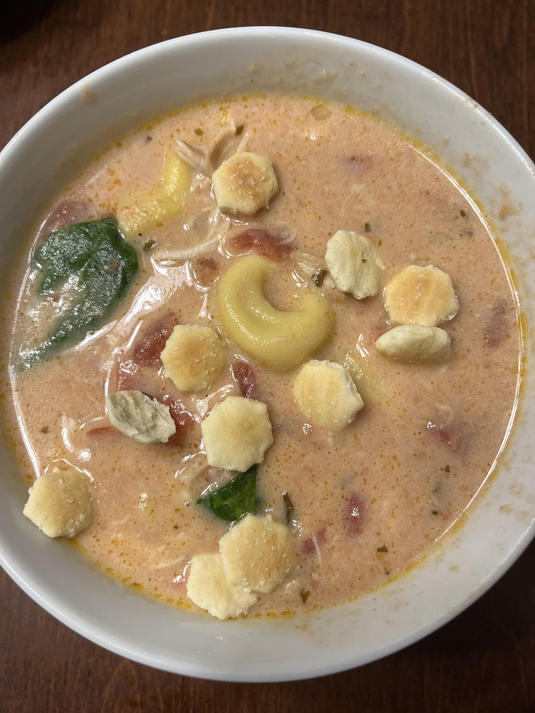 1 medium yellow onion, diced, 1/3 cup all purpose flour, 1 Tbsp dried basil, 2 cloves of garlic, minced, 2 Tbsp tomato paste, 3 Tbsp olive oil, 4 cups chicken broth, 2 (14.5 oz) cans petite diced tomatoes, 1 to 1 1/2 lbs boneless skinless chicken thighs, 1 tsp salt, 1/2 tsp pepper, 4 cups frozen cheese tortellini (or you can use fresh), 3 cups packed spinach, 1/2 cup Parmesan cheese, 1 cup heavy cream or 1 cup half and half