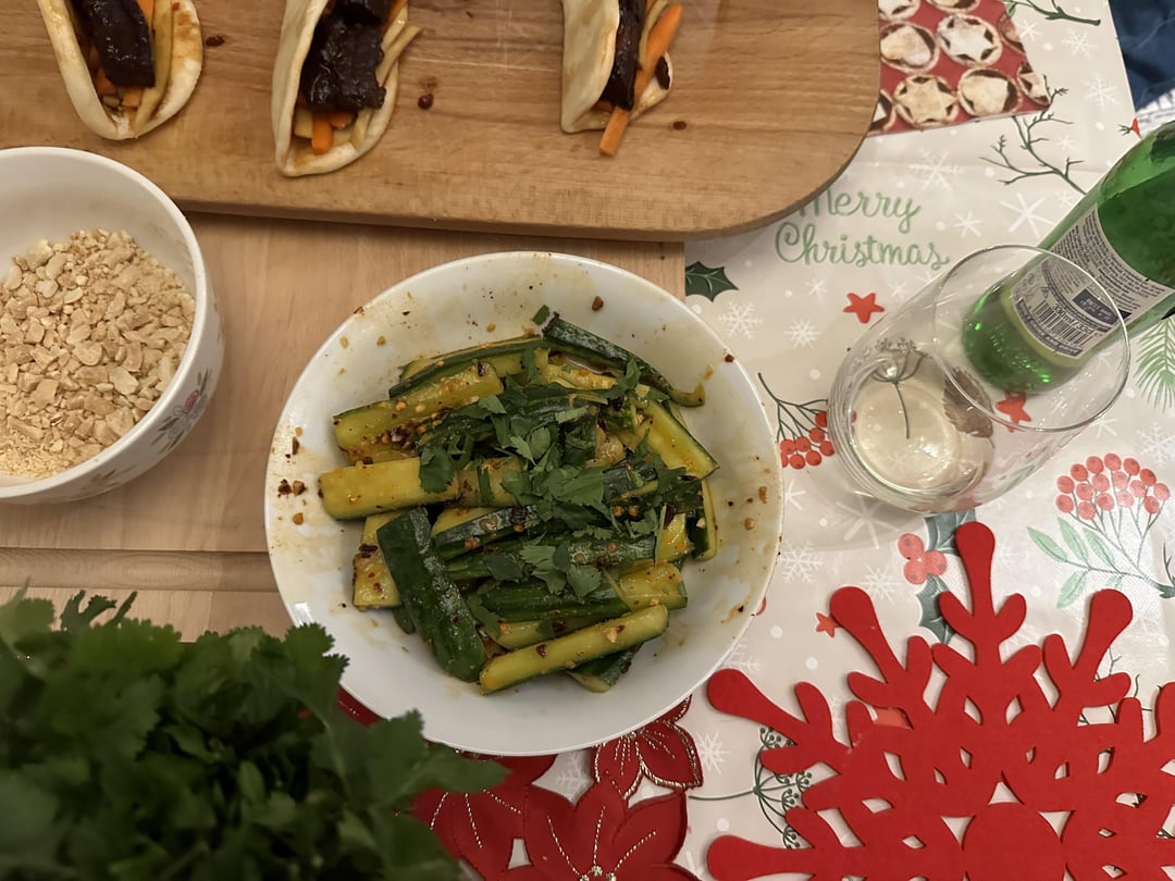 Sides: Smashed Cucumber Salad and Miso Butter Corn on the Cob