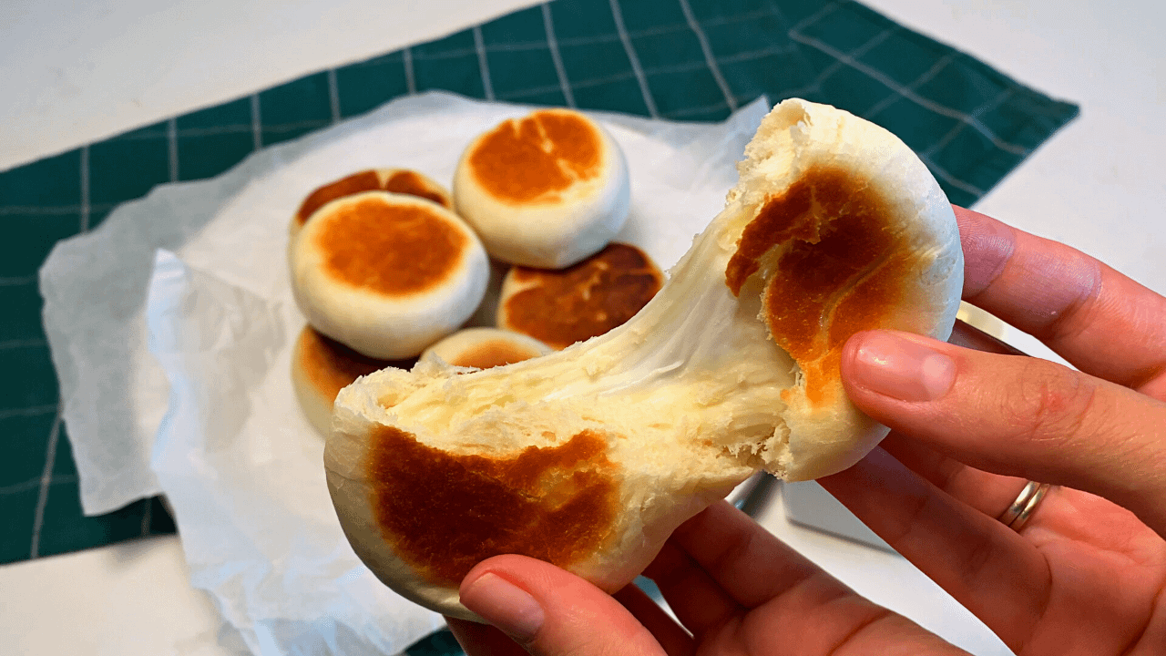 6. When the dough has risen, heat a pan over medium heat (no oil). Place buns as many as fit and cook for 5-6 minutes on each side over medium heat (reduce heat to below medium if crust comes out too dark). Slightly press with a spatula after the first flip of buns.