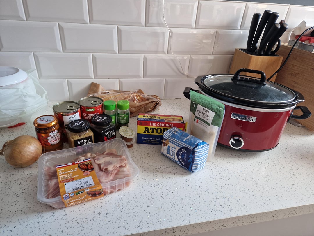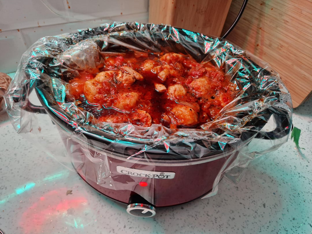 Tesseon 3 years ago A slow cooker version of this: [https://www.bbcgoodfood.com/recipes/chicken-arrabbiata-stew-parmesan-dumplings](https://www.bbcgoodfood.com/recipes/chicken-arrabbiata-stew-parmesan-dumplings)Fried the onions and seared the chicken before throwing everything in the slow cooker pot for 4 hours on high. Added the dumplings and back on for 30 mins. I made slightly different dumplings with the following:* 150g self raising flour * 70g suet * 80g parmesan * 100ml water