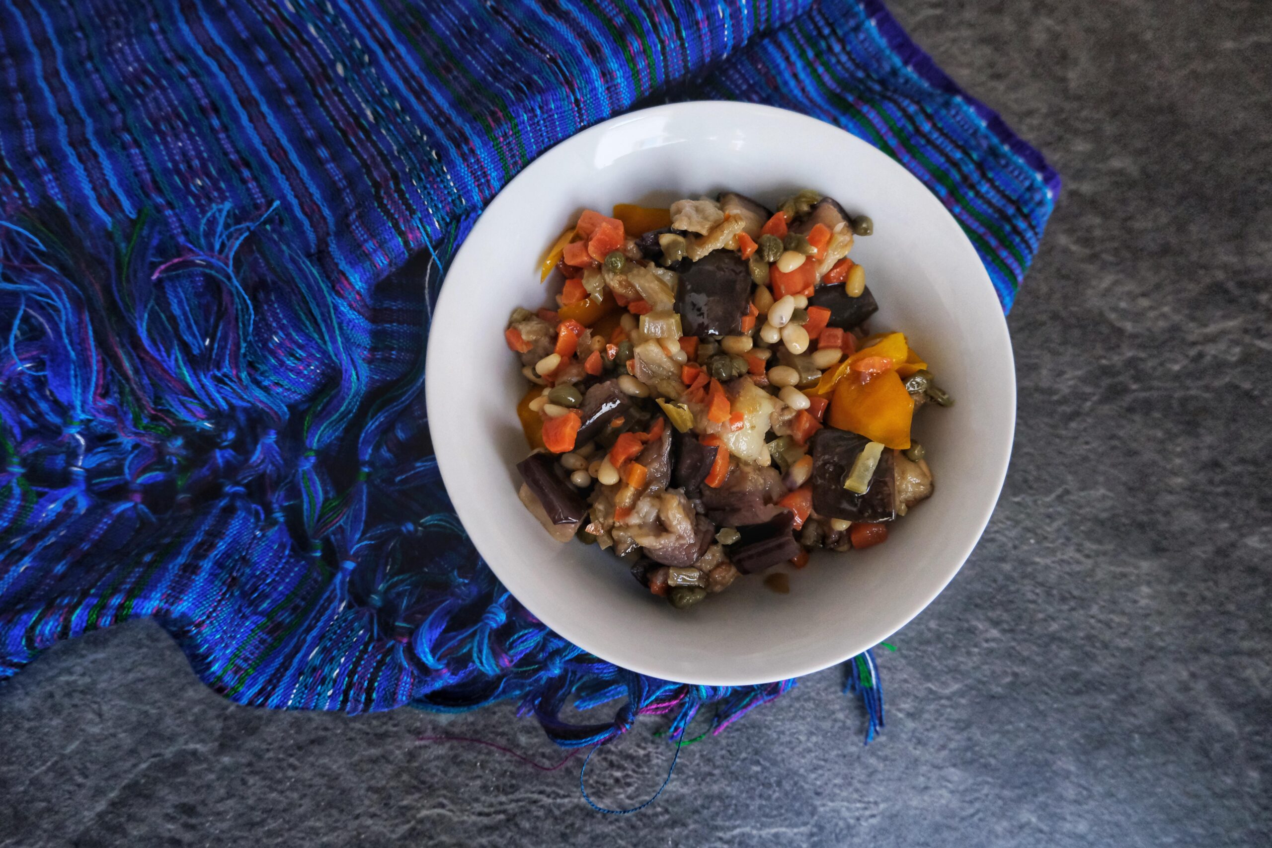 1. Fill a medium-sized frying pan with about a half-inch or sunflower oil over medium-high heat. Once the oil is sizzling (you’ll hear a few pops), lower the heat to medium and add the eggplant for about 8 – 10 minutes or until it’s lightly browned on all sides. 2. Remove the eggplant with a slotted spoon and transfer it to a bowl. If the eggplant looks too oily, you can put paper towels in the bowl to absorb some of the oil like latkes. 3. Add the chopped bell pepper and cook for about 3 – 5 minutes. Transfer it to the bowl with a slotted spoon and add in both the celery and carrots for about two minutes. They should be crispy. Transfer to the bowl with the slotted spoon again. 4. Next, remove the oil from the skillet (pouring it into a separate container, never down the drain) and wipe it down with a paper towel. Put all of the vegetables back in over medium heat. Add the pine nuts, capers, sugar, and white vinegar. Cook until the liquid is absorbed, about 5 – 10 minutes. Then, remove from heat and let cool. Add kosher salt to taste and serve at room temperature or the next day.