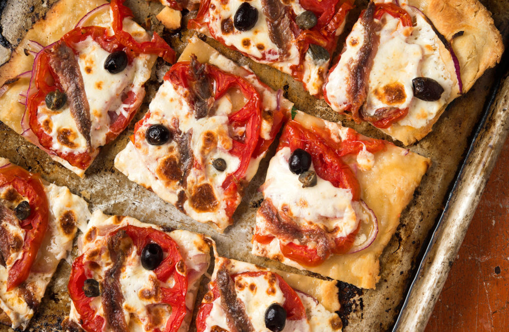 - Stir 2 tablespoons olive oil and the garlic together in a small bowl. Put rolled dough on lightly greased baking sheet. Drizzle surface of dough with garlic oil. Scatter onion slices over dough. Arrange tomato slices over dough in one layer without crowding, then season with salt and pepper. Top tomatoes with torn mozzarella slices in one layer. Tuck olives and capers here and there, if using. Drape top of tart with intermittently placed anchovy fillets.