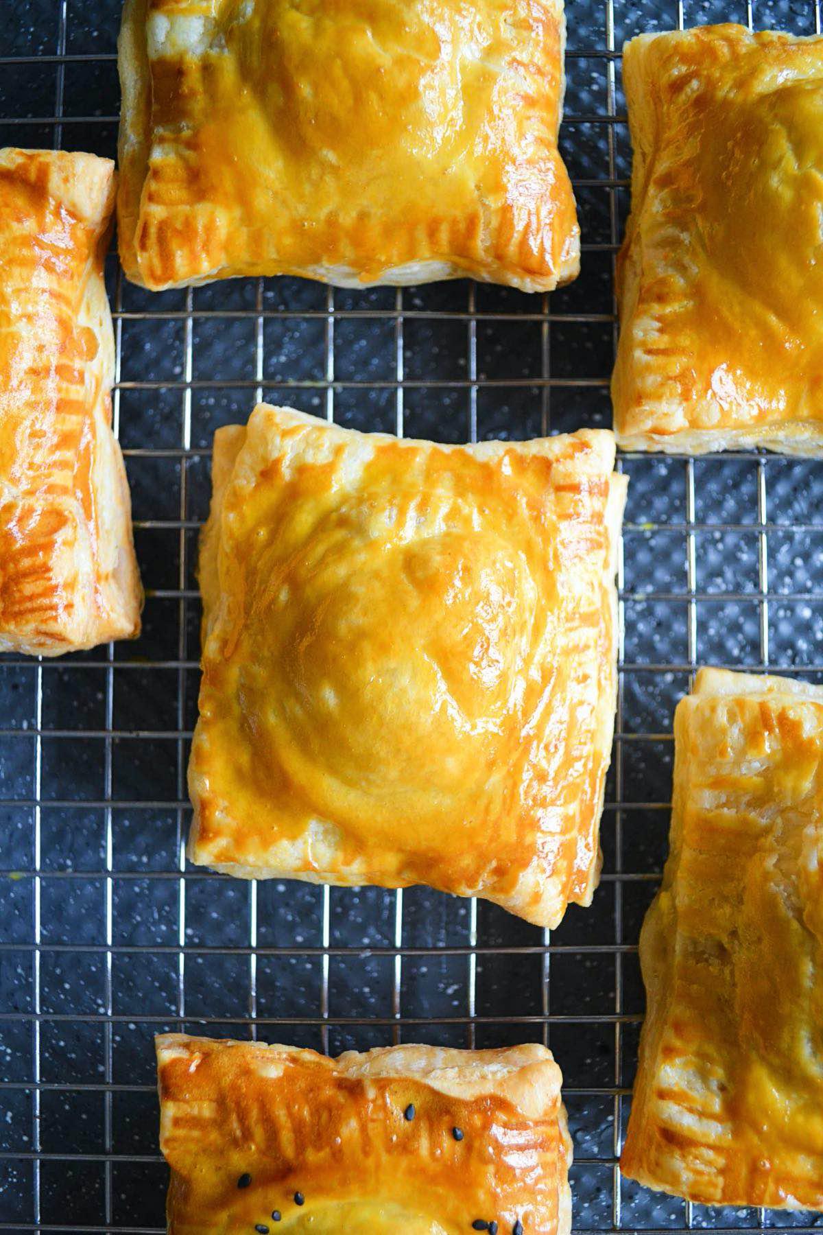 7. **Bake.** Bake the puff pastry on the middle rack for 30 mins or until it is puffed up and golden brown on the top. Take out and let it rest for 5 minutes and transfer to cooling rack.