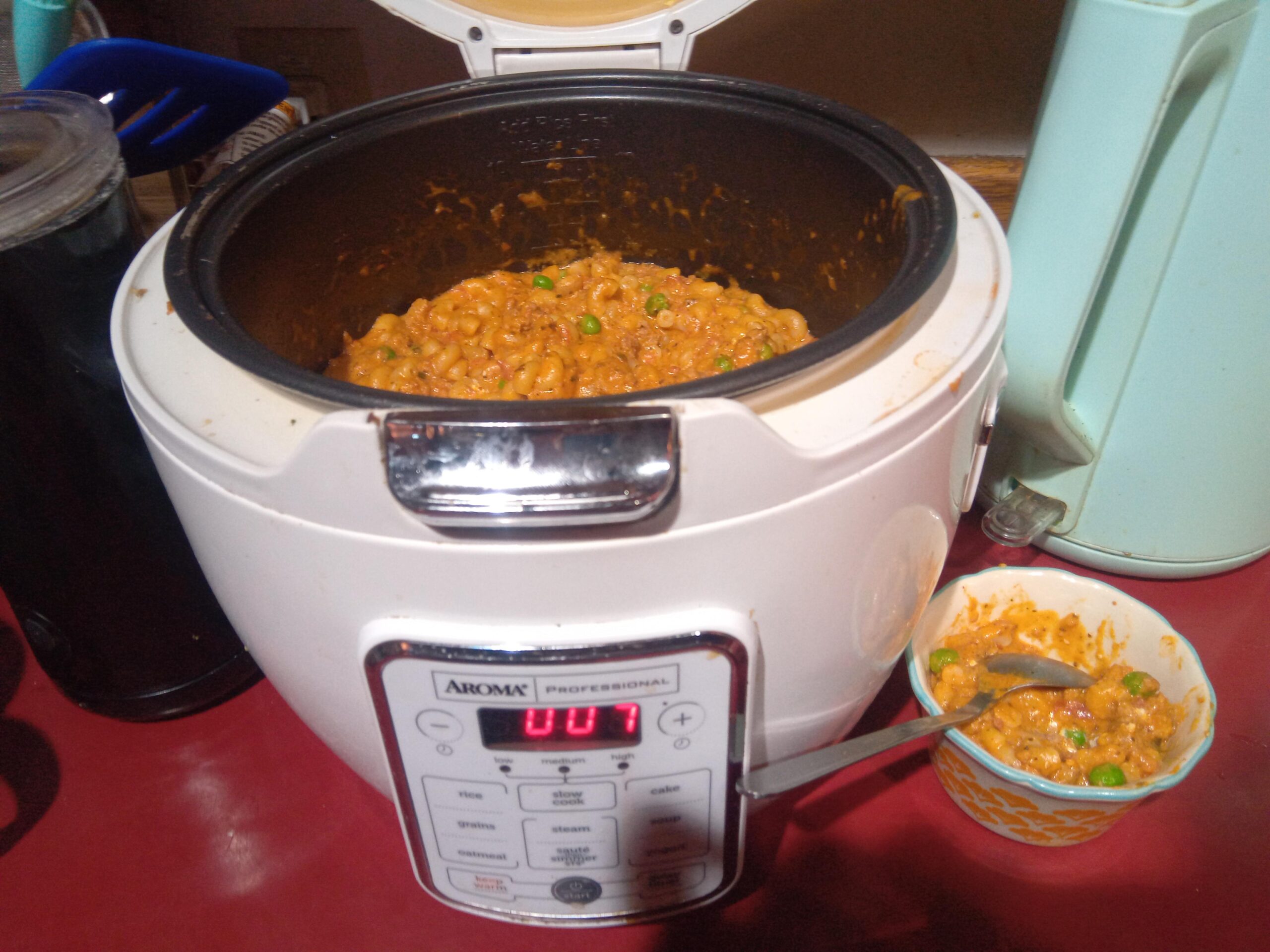 It took about 3 hours on my Aromaware Professional slow cooker setting on medium and looked very soupy. Add d pasta and it took about 40 more minutes. I did stir pasta about every 10 minutes.